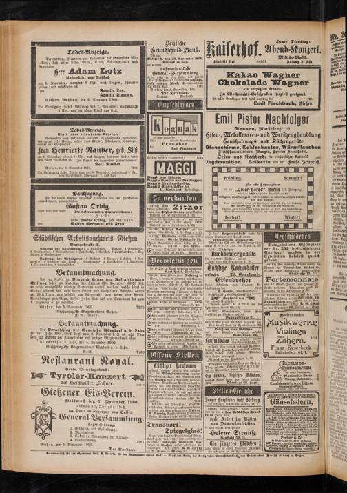 Die Beerdigung findet Donnerslag den 8. November, nachmittags 2 Uhr, vom Sterbehause, Löwengasse 2, aus statt.