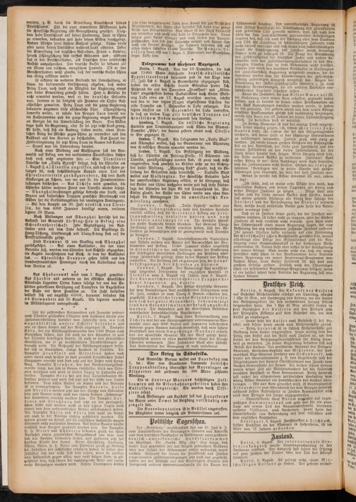 Nach einer Meldung aus Washington soll der Vormarsch auf Peking von den verbündeten Streitkräften bisher doch noch nicht angetreten sein. — Eine Tievtsiner Depesche des „Daily Expreß" besagt, daß die Chinesen am 1. August (s. o.) T i e n t s i n a n g r i f s e n, und daß es ihnen gelungen sei, nach sechsstündigem Kampfe einen Teil des Chinesenviertels zurückzuerobern, sich dort starke Stellungen zu sichern, von wo aus sie die Fremdennieber- laffungen beschießen. — Aus Tschisu wird gemeldet, die Chinesen hätten mehrere Forts von Tientsin wieder besetzt. — Shanghaidrahtungen zufolge bedroht eine starke, aus Boxern und kaiserlichen Truppen gemischte Streitmacht von Süden her die Verbindungslinie der vereinigten Kontingente. — Bei dem Kampfe am 30. Juli nördlich von Tientsin, bei dem 4000 Japaner beteiligt waren, verloren letztere 29 Mann.