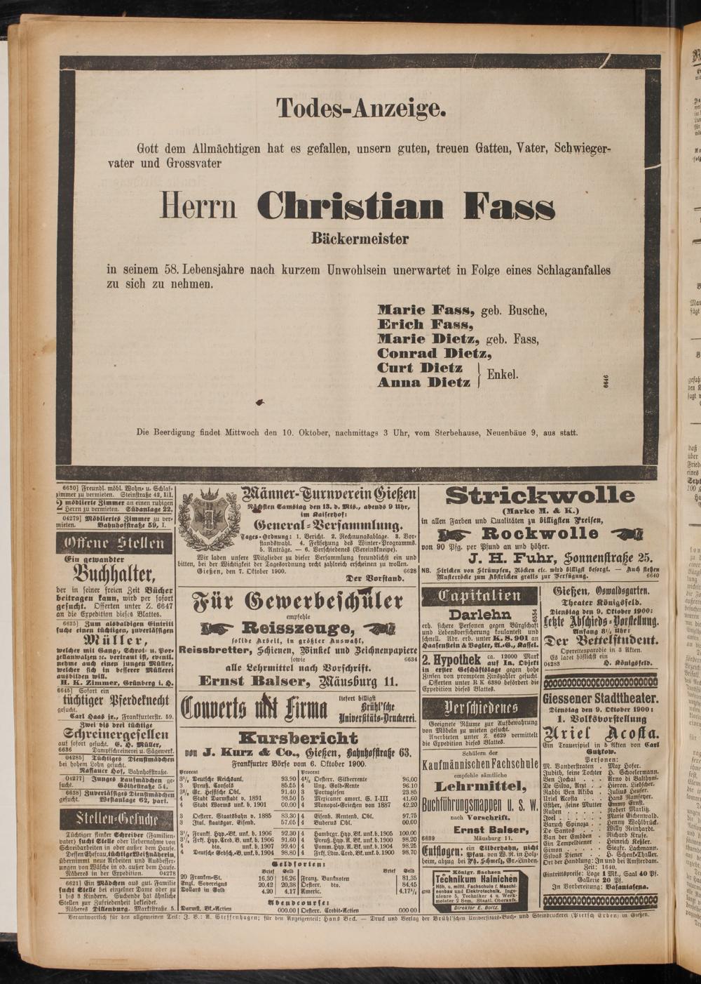 Die Beerdigung findet Mittwoch den 10. Oktober, nachmittags 3 Uhr, vom Sterbehause, Neuenbäue 9, aus statt.