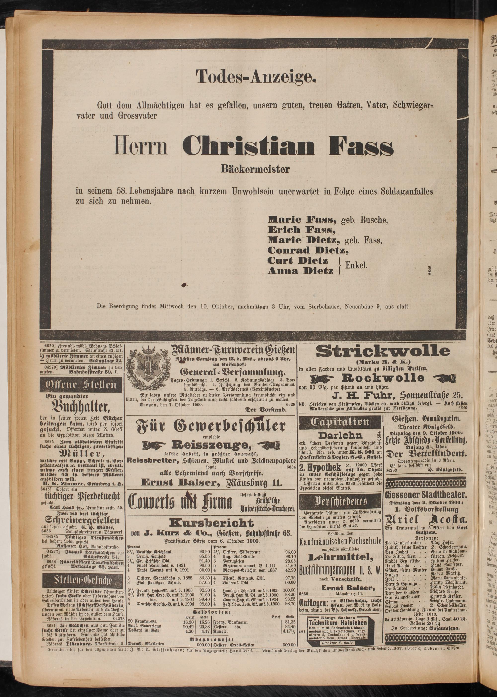 aoooooooooocoooooooooooo Giessener Stadttheater. Dienstag den 9. Oktober 1900 r 1 Volksvorstellung Uriel Acosta.