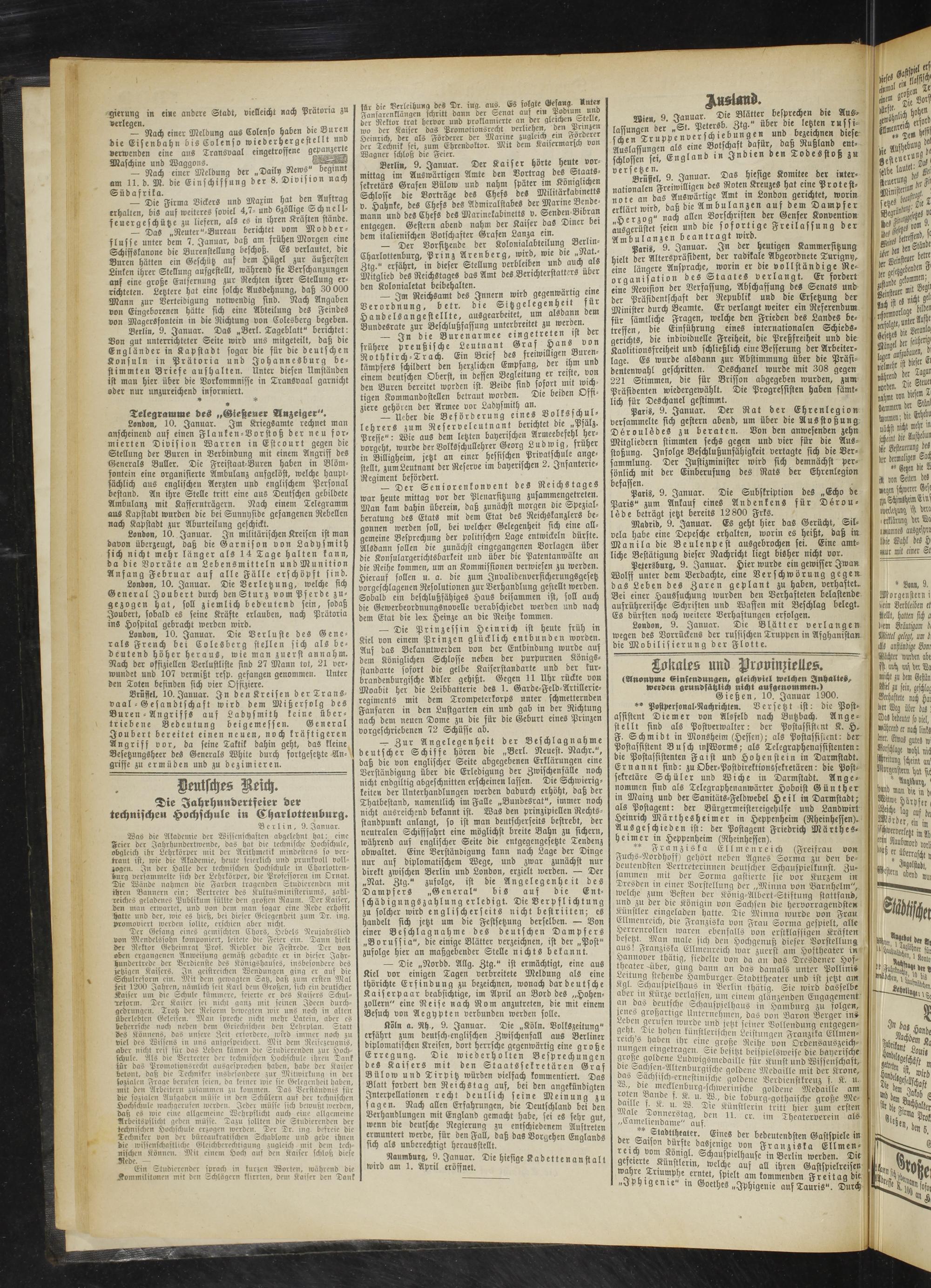 London, 10. Januar. Im Kriegsamte rechnet man anscheinend auf einen Flanken-Vorstoß der neu formierten Division Warren in Estcourt gegen die Stellung der Buren in Verbindung mit einem Angriff des Generals Buller. Die Freistaat-Buren haben in Blörn- fontein eine organisierte Ambulanz aufgelöst, welche hauptsächlich aus englischen Aerzten und englischem Personal bestand. An ihre Stelle tritt eine ans Deutschen gebildete Ambulanz mit Kaffernträgern. Nach einem Telegramm aus Kapstadt wurden die bei Sunnyside gefangenen Rebellen nach Kapstadt zur Aburteilung geschickt.
