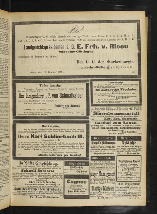 Unterfertigter C. G. erfüllt hiermit die traurige Pflicht, seine lieben E. M. E. M. A H. A. H, und i. a. C. B. i. a. C. B. von dem am 8. Februar 1900 zu Giessen erfolgten Ableben des A. H. E. M.