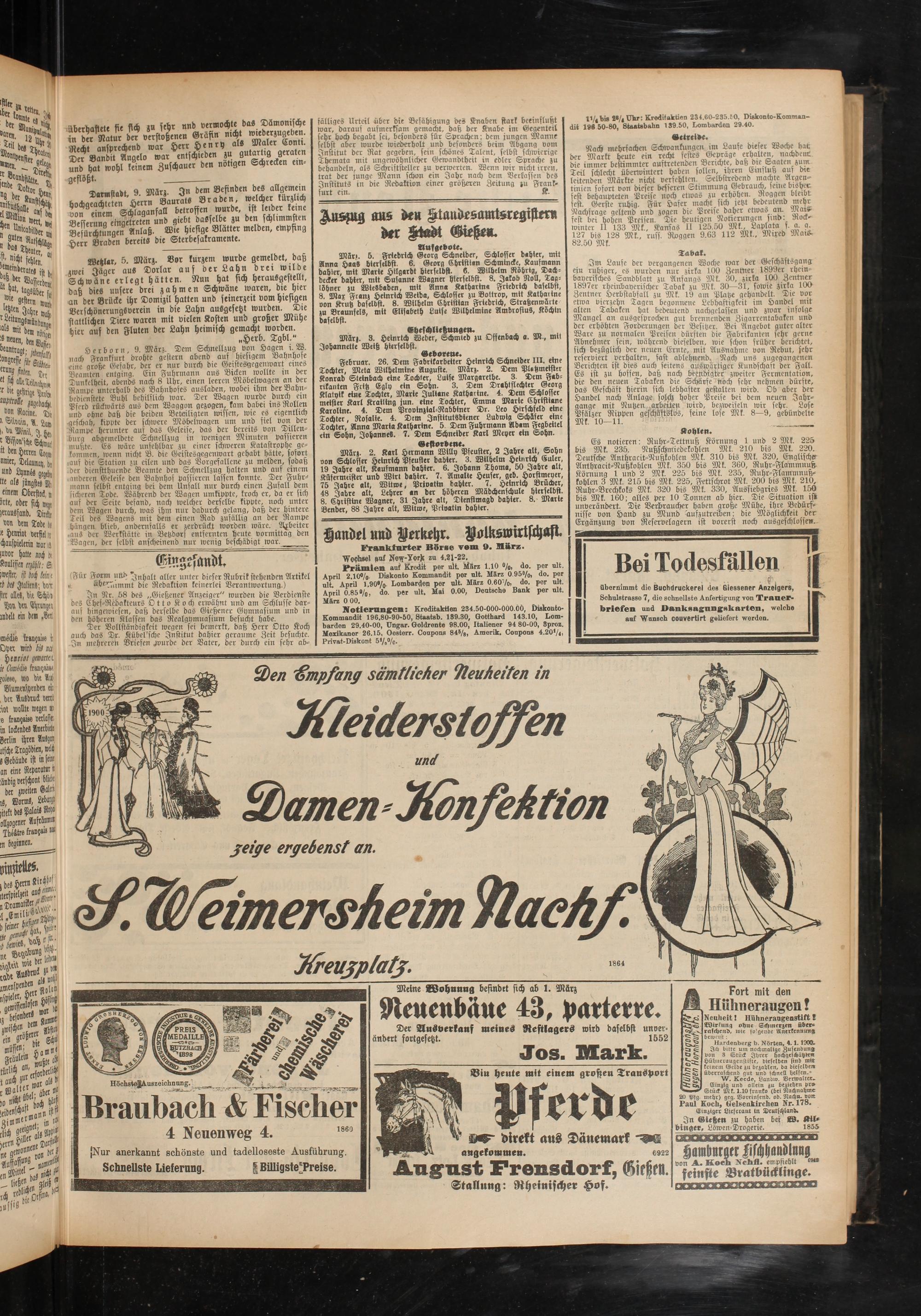 März. 2. Karl Hermann Willy Pfeuster, 2 Jahre alt, Sohn von Schlosser Heinrich Pfeuster dabier. 3. Wilhelm Heinrich Euler, 19 Jahre alt, Kaufmann dahier. 6. Johann Thoma, 50 Jahre alt, Kiifermrister und Wirt dahier. 7. Amalie Heuser, geb. Horstmeyer, 75 Jahre alt, Witwe, Privattn dahier. 7. Heinrich Brücher, 48 Jahre alt, Lehrer an der höheren Mädchenschule hierfelbst. 8. Christine Wagner, 31 Jahre alt, Dtenstmagd dahier. 8. Marte Bender, 88 Jahre alt, Witwe, Pcivatin dahier.