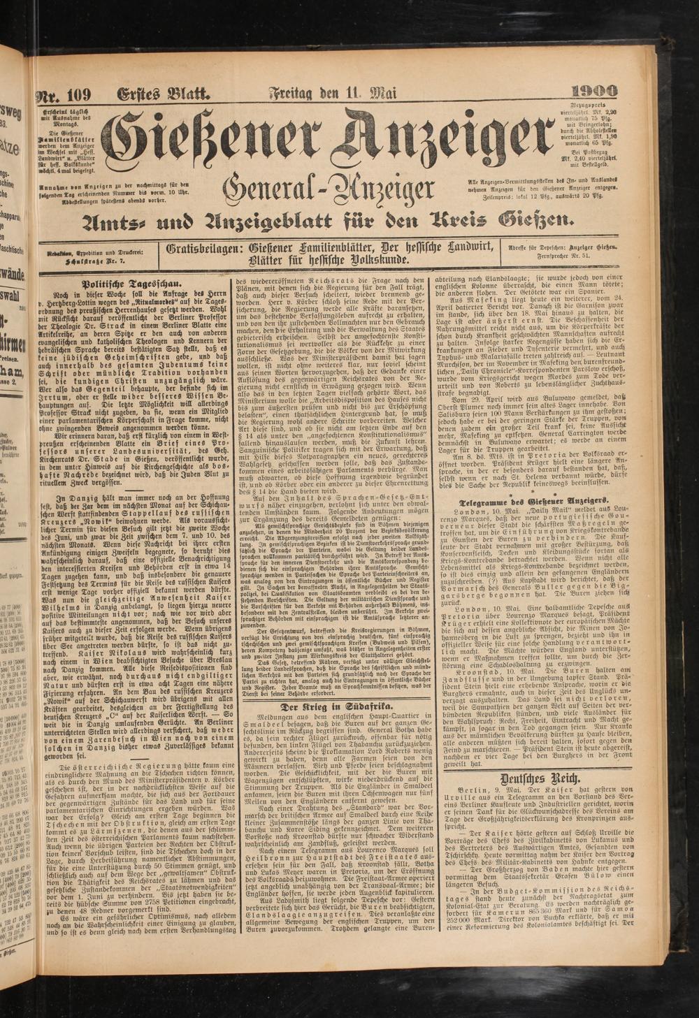 Nach einem Telegramm aus Lourenco Marques soll Heilbronn zur Hauptstadt des Freistaates ausersehen sein für den Fall, daß Knoonstad fällt, Botha und Lukas Meyer waren in Pretoria, um der Eröffnung des VolksraadH beizuwohnen. Die Freistaat-Armee operiert jetzt angeblich unabhängig von der Transvaal-Armee; die Engländer hoffen, sie werde jeden Augenblick kapitulieren.