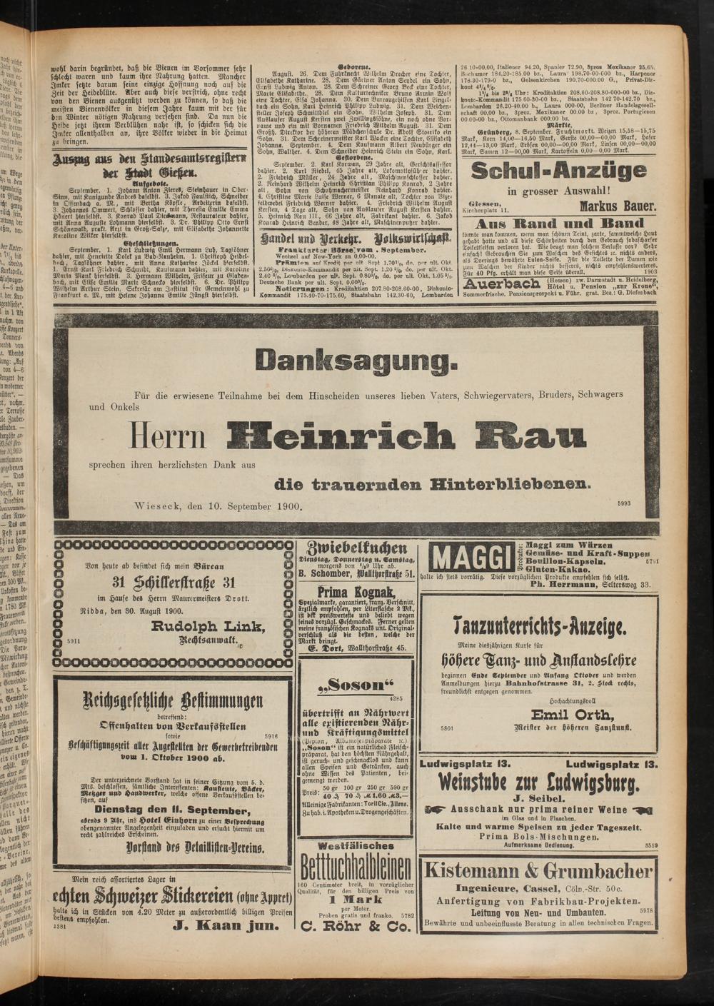 September. 1. Karl Ludwig Emil Hermann Luh, Taglöhner dahier, mit Henriette Dolek zu Bad-Nauheim. 1. Christoph Heidel' dich, Taglöhner dahier, mit Anna Katharine Jöckel h'erselbst. 1. Ernst Karl Friedrich Schmidt, Kaufmann dahier, mit jtaiolmc Maria Man! Hierselbst. 3. Hermann Wilhelm, Friseur zu Gladenbach, mit Elise Emilie Marie Schnecko hierselbst. 6. Dr. Philipp Wilhelm Arthur Stein, Sekretär am Institut für Gemeinwohl zu Frankfurt a. M., mit Helene Johanna Emilie Jüngst hierselbst.