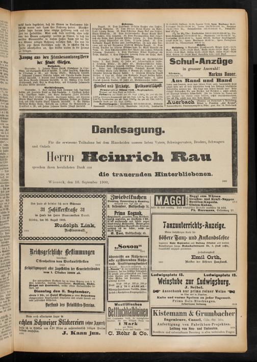 Siptember. 2. Karl Korwan, 29 Jahre alt, Gerichtsassesior dahier. 2. Karl Riebel, 45 Jahre eit, Lokomotivsüh' er dahier. 2. Friedrich Müller, 24 Jahre alt, Maschinenschlosser dahier. 2. Reinhard Wilhelm Heinrich Christian Philipp Konrad, 2 Jahre alt, Sohn von Schvhmachermeister Reinhard Konrad dahier. 4. Christine Marie Luise Werner, 6 Mrnate alt, Tochter von Vize- feldwebel Friedrich Werner dahier. 4. Friedrich Wilhelm August Kersten, 4 Tage alt, Sohn von Ausläufer August Kersten dahier. 5. Heinrich Rau III., 66 Jahre alt, Fabrikant dahier. 6. Jakob Konrad Heinrich Bender, 48 Jahre alt, Maschinenputzrr dahier.
