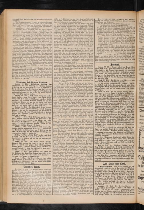 Berlin, 10. Mai. Das Kaiserpaar unternahm Mstern, wie aus Kürzel gemeldet wird, einen zwei- srunorgen Spazierritt durch .den Wald von Kürzel über Landonvillers und Lillers. Am Nachmittage besichtigte r>er Kaffer in Begleitung des Bezirkspräsidenten Freiherru von Hammerstein die neuen Bauten und die zum Schlosse Urvrlle gehörigen Wirtschaftsgebäude, sowie das neuein- gerichtete Elektrizitätswerk, feilte findet eine Truppenschau über die! Metzer Garnison bei Freskaty statt. Tas Kaiserpaar fuhr um 8 Uhr 10 Minuten mit dein Sonder- zuge nach Freskaty ab. Wie verlautet, wird der Kaiser heute nachmittag das Fort Saulny besuck>en. — Der Kriegsminister v. Goßler ist gestern mittag in Kürzel einge- ttoffen. Gestern abend mm 7 Uhr 30 Minuten traf der kaiserliche Statthalter Fürst zu .Hohenlohe-Langenburg in Kürzel ein, um der heutigen Truppenschau beizuwohnen.