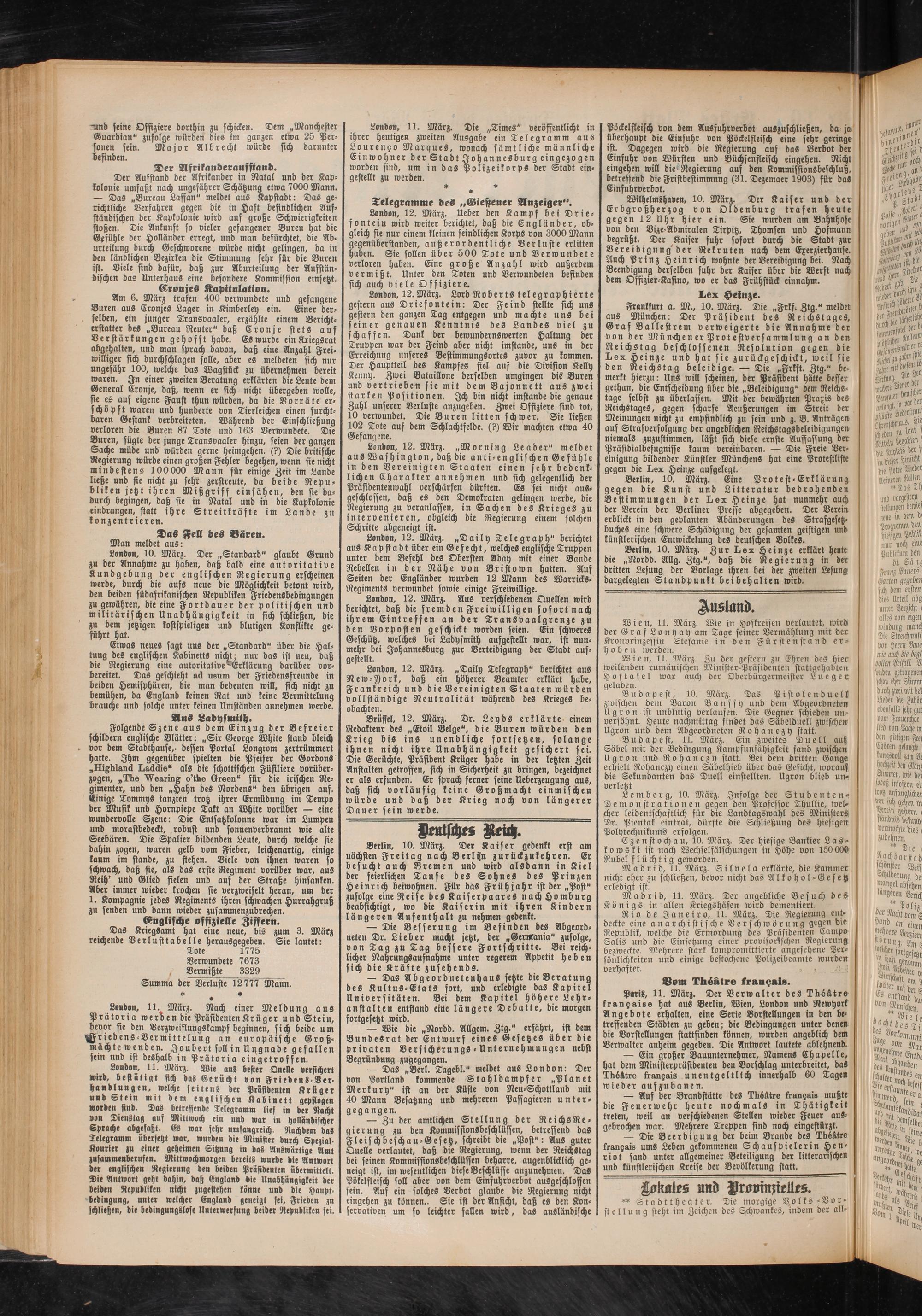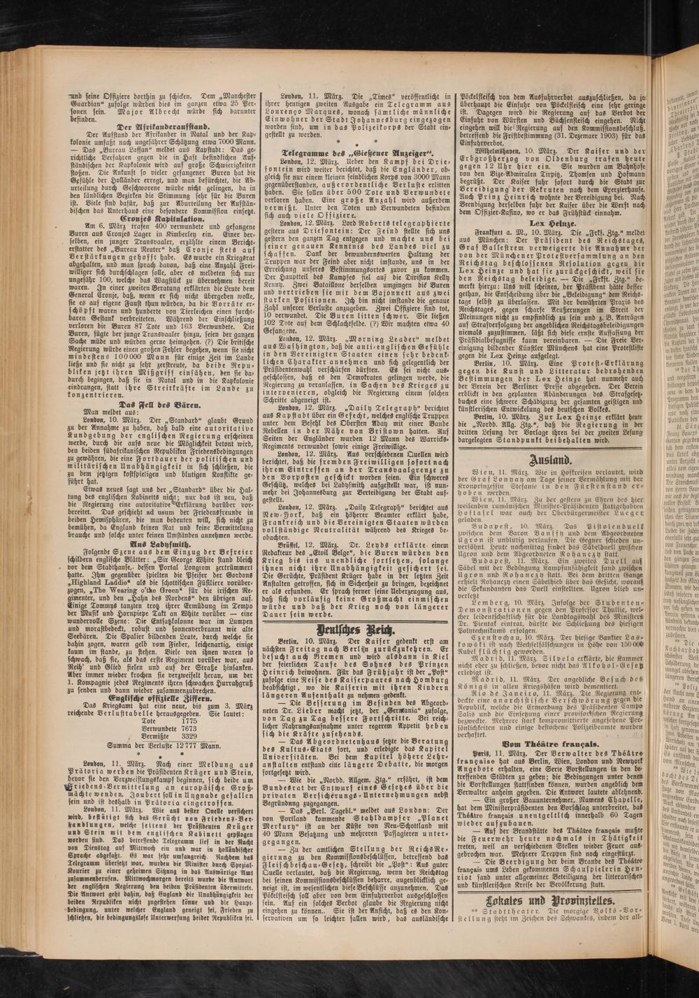 Loudon, 12.März. Lord Roberts telegraphierte gestern aus Driefontein: Der Feind stellte sich uns gestern den ganzen Tag entgegen und machte uns bei seiner genauen Kenntnis des Landes viel zu schaffen. Dank der bewundernswerten Haltung der Truppen war der Feind aber nicht imstande, uns in der Erreichung unseres Bestimmungsortes zuvor zu kommen. Der Hauptteil des Kampfes fiel aus die Division Kelly Kenny. Zwei Bataillone derselben umgingen die Buren und vertrieben sie mit dem Bajonnett aus zwei starken Positionen. Ich bin nicht imstande die genaue Zahl unserer Verluste anzugeben. Zwei Offiziere sind tot, 10 verwundet. Die Buren litten schwer. Sie ließen 102 Tote auf dem Schlachtfelde. (?) Wir machten etwa 40 Gefangene.