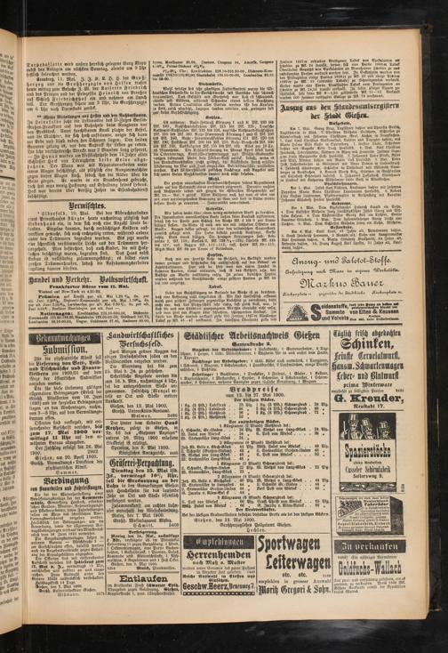 Am 7. Mai. Georg Krug, Taglöhner dahier mit Theresia Grosch, Taglühnerin in Müs. 7. Christian Wilhelm Gelshorn, Schlosser zu Altenseelbach mit Johanna Christiane Graf, Köchin in Neunkirchen. 7. Carl Emll Chrffttan Malkomesius, Sattler und Tapezier dahier, mit Marie Helene Elise Galle in Sprcmberg. 7. Gustav Loose, Schreiner dahier mit Auguste Elise Traß Hierselbst. 8. Mai. Karl Chrchian Friedrich, Lederhändler, Wittwer in Alzey mit Henriette Juliane Georgine Luise Margarethe Eicke Hierselbst. 8. Johannes Pettr Minko, Küfer und Wirt, Witwer dahier mit Marie Luh Hierselbst. 9. Mai. Peter Jost, Fabrikarbeiter in Göbelnrod mit Anna Deines in Lindenstruth. 9. Friedrich Ellenberger, Schlosser in Düffeldorf mit Elisabeth Nürnberger in Reiskirchen 9. Konrad Moritz Bilz, Gärtner in Großkarben mit Elisabeth Schönhals daselbst. 9. Johannes Hasselbach Steinhauer in Londorf mit Katharina Wilhelmine Luise Goth in Altenkirchen.