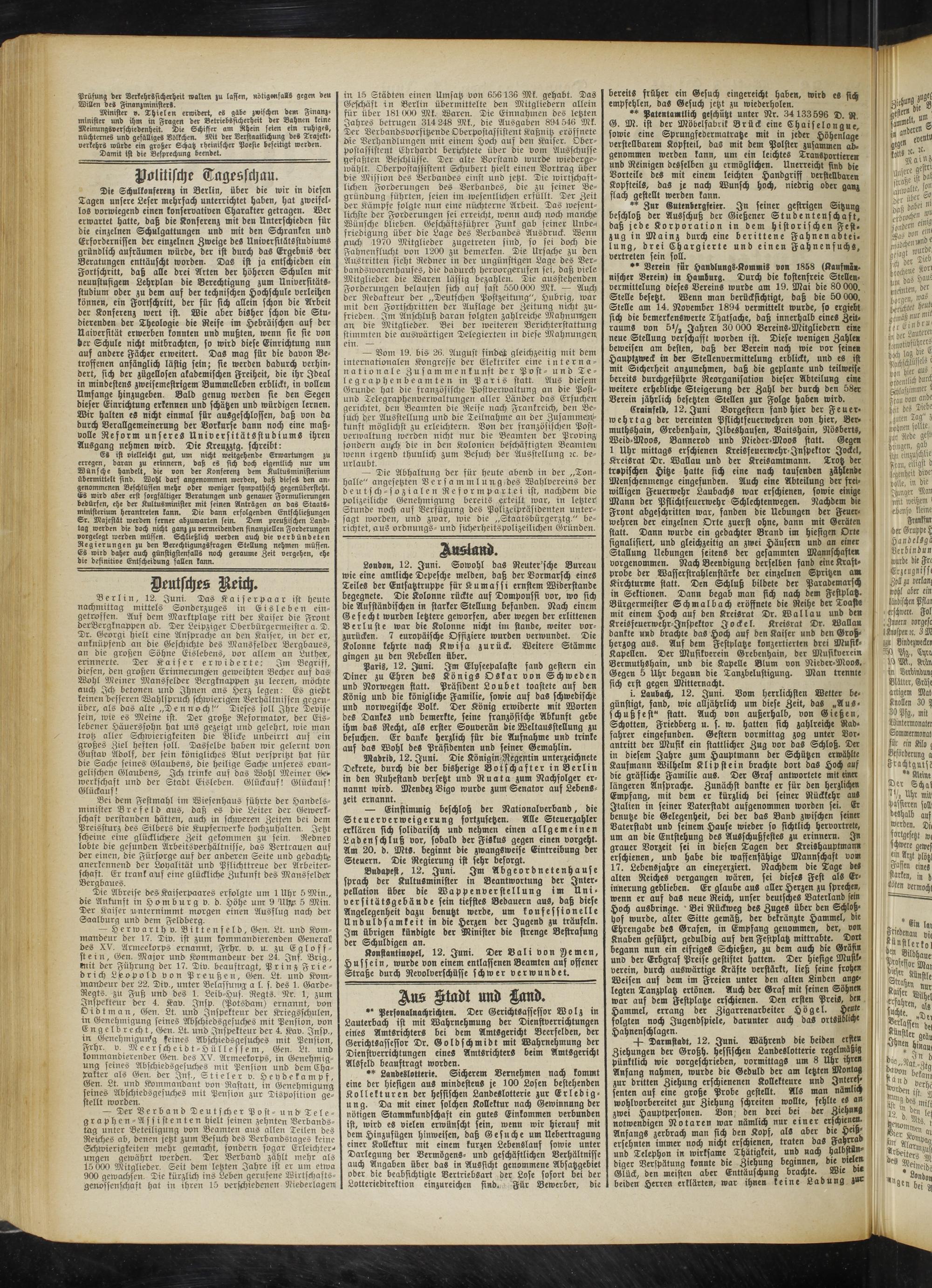 Die Abreise des Kaiserpaares erfolgte um 1 Uhr 5 Min., die Ankunft in Homburg v. d. Höhe um 9 'Utyp 5 Min. Der Kaiser unternimmt morgen einen Ausflug nach der Saalburg und dem Feldberg.