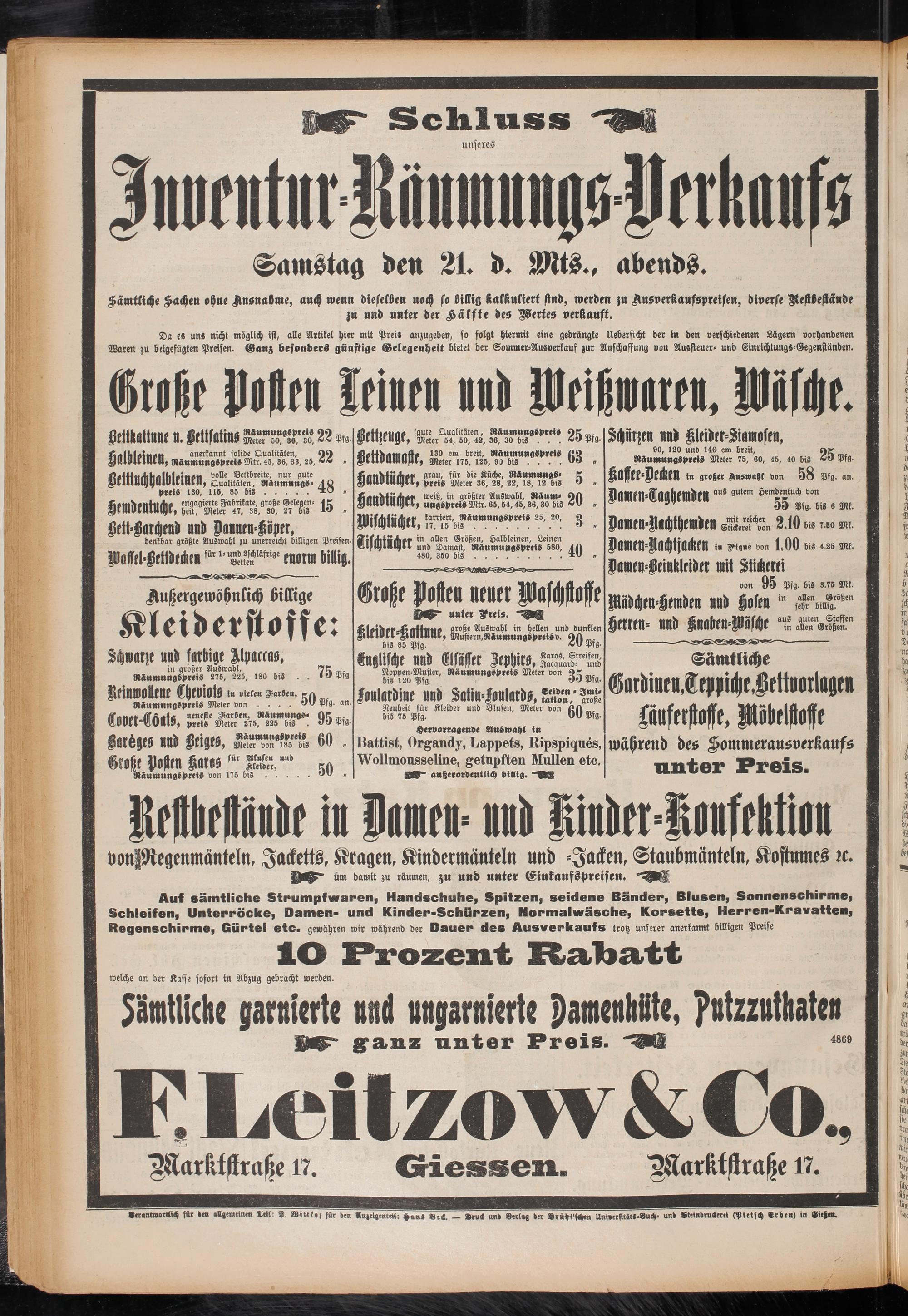 Auf sämtliche Strumpf waren, Handschuhe, Spitzen, seidene Bänder, Blusen, Sonnenschirme, Schleifen, Unterröcke, Damen- und Kinder-Schürzen, llormalwäsche, Korsetts, Herren-Kravatten, Regenschirme, Gürtel etc. gewähren wir während der Dauer des Ausverkaufs trotz unserer anerkannt billigen Preise