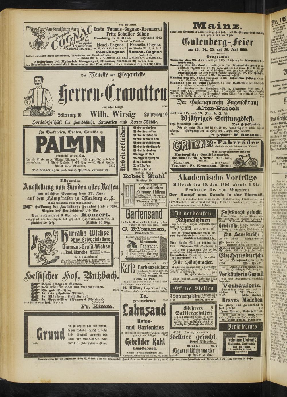 verantwortlich für den allgemeinen Teil: P. Dtttka; für des «nzeigentall: ^cn< «eck. — »ruck und «erlag der Brühl'scheu Univerfitätr-Buch- und Steindruckerei (Pietsch Erben) in Gießen.