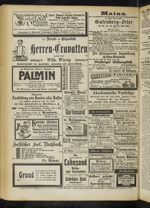 Eintrittskarten für Ausstellung (Mk. 1), Akademische Feier (Mk. 2k Festesten (Mk. 4.50), Kommers (50 Pfg.), Tribünensitz auf dem Gutenbergplok (Mk. 10), Kostümfest (Mk. 3 im Borverkauf, später Mk. 5) find erhältlich bei Herrn I Diemer, Große Bleiche 19 in Mainz._________________ 4086