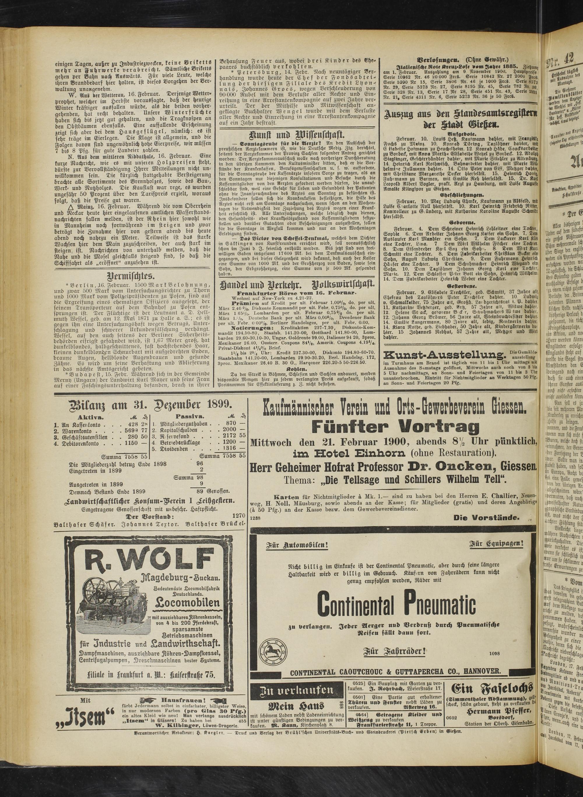 Mittwoch den 21. Februar 1900, abends 8% Uhr pünktlich, im Hotel Einhorn (ohne Restauration),