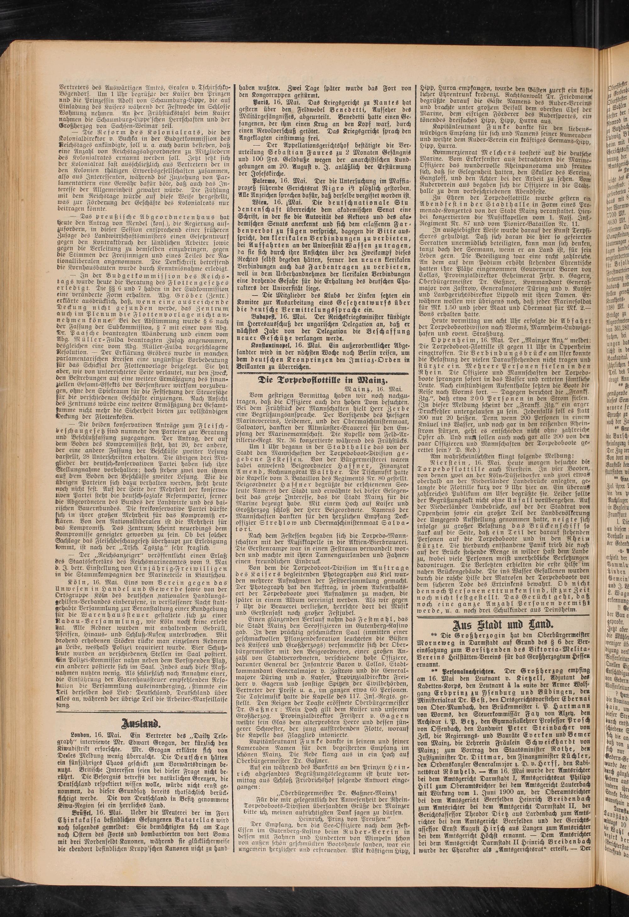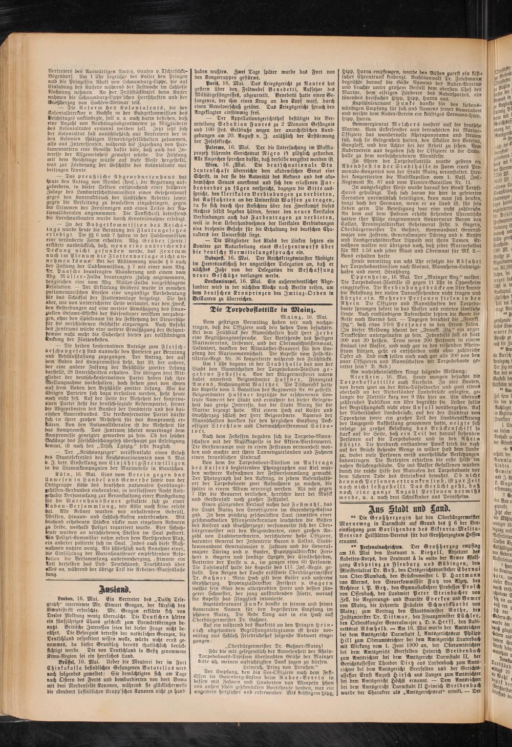 Zu Ehren der Torpedoflottille wurde gestern ein Abendfest in der Stadthalle in Form eines Promenade-Konzertes von. der Stadt Mainz veranstaltet. Hierbei konzertierten die Musikkapellen vom 1. Nass. Jnf.- Regiment Nr. 87 und vom Pionier-Bataillon Nr. 11.