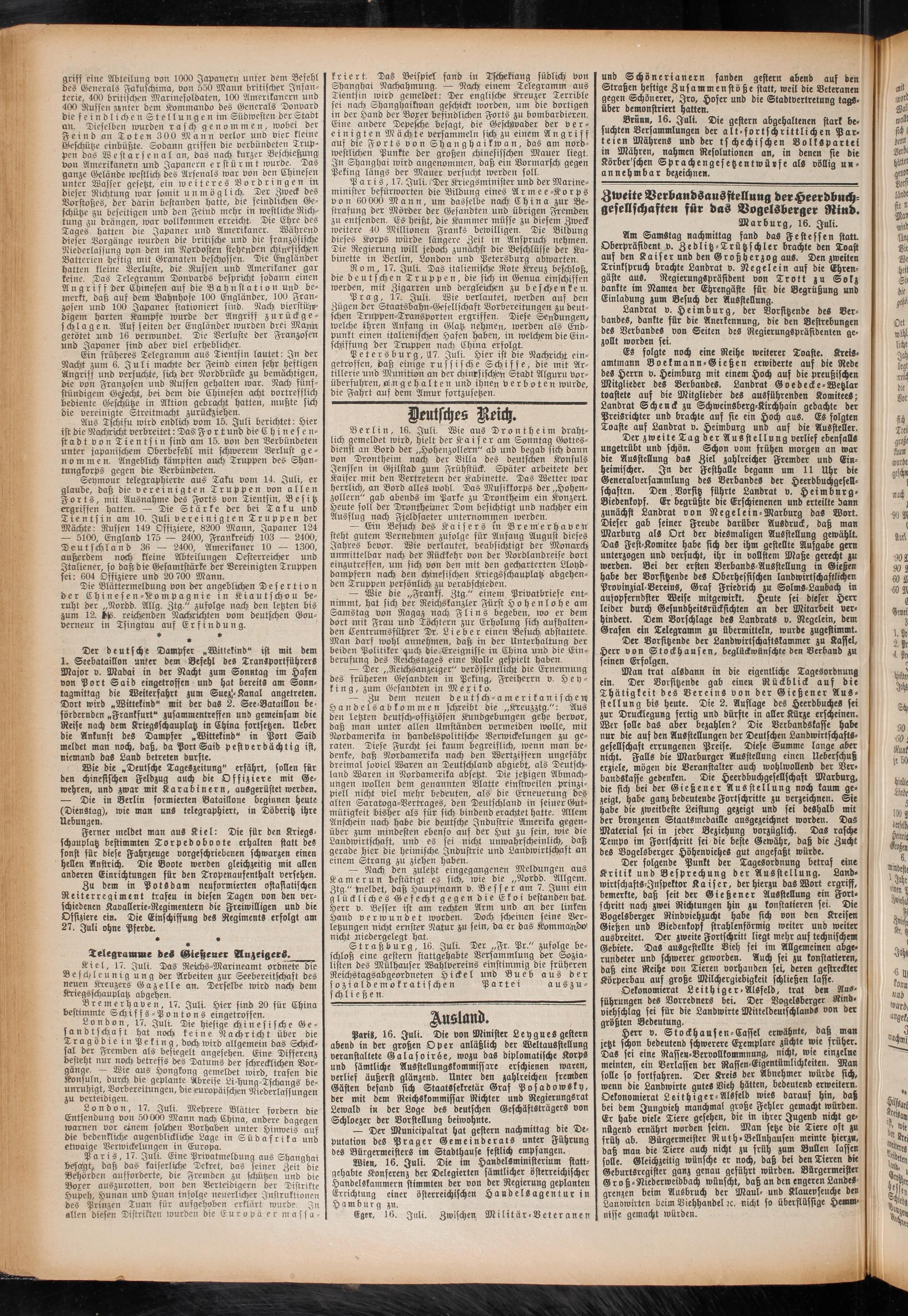 Zu dem in Potsdam neuformierten ostasiatischen Reiterregiment trafen in diesen Tagen von den verschiedenen Kavallerie-Regimentern die Freiwilligen und die Ofsiziere ein. Die Einschiffung des Regiments erfolgt am 27. Juli ohne Pferde.