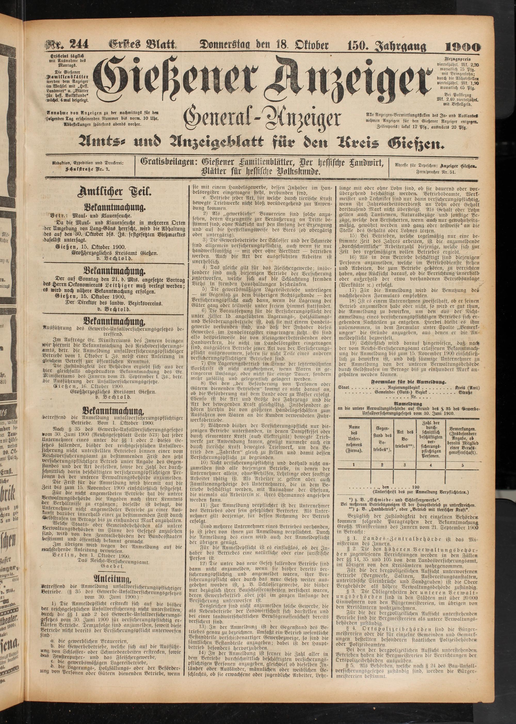 19) Schließlich wird darauf hingewiesen, daß nach der vom Reichs-Versicherungsamt erlassenen Bekanntmachung die Anmeldung bis zum 15. November 1900 einschließlich zu bewirken ist, und daß säumige Unternehmer zu der Anmeldung von der unteren Verwaltungsbehörde durch Geldstrafen im Betrage bis zu einhundert Mark angehalten werden können.