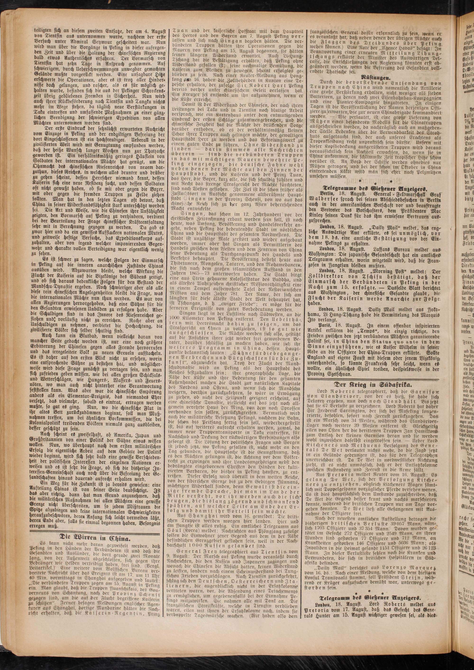 Der erste Eindruck der sehnlichst erwarteten Nachricht vom Einzuge in Peking und der endgiltigen Befreiung der dort Eingeschlossenen ist ein hochfreudiger. Ueberaö in der zivilisierten Welt wird mit Genugtuung empfunden werden, daß der heiße Wunsch langer Wochen nun zur Thatsache geworden ist. Ein verhältnismäßig geringes Häuflein von Soldaten der internationalen Mächte hat genügt, um die Ohnmacht des chinesischen Riesenreiches von neuem bar» zuthun, dieses Reiches, in welchem alles drunter und drüber zu gehen scheint, beffeit Herrscher niemand kennt, dessen Kaiserin sich eine neue Residenz sucht, und dessen Soldaten oft nicht gewußt haben, ob sie mit oder gegen bie Boxer, mit ober gegen die fremden Truppen zu Felde ziehen sollten. Man hat in den letzten Tagen oft betont, daß China in seiner Widerstandsfähigkeit stark unterschätzt worden sei. Die Art unb Weise, wie die Chinesen ihre Unfähigkeit zeigten, den Vormarsch auf Peking zu verhindern, verdient bei der Beurteilung der Frage chinesischer Kräfteentfaltung sehr mit in Berechnung gezogen zu werden. Da gab es zwar hier und da ein gewisses Aufflackern nationalen Mutes, unb zeitweise heftige Versuche, bas Expeditionskorps aufzuhalten, aber von irgend welcher imponierenden Gegen- , mehr und charakte vollen Verteidigung war eigentlich wenig zu sehen.