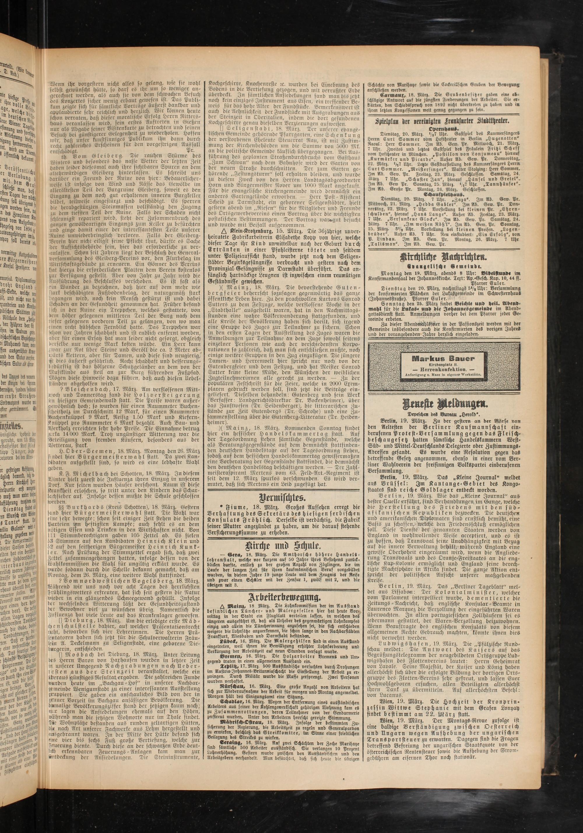 )( Mainz, 18. März. Kommenden Sonntag findet hier ein hessischer Handelskammertag statt. Auf der Tagesordnung stehen sämtliche Gegenstände, welche als Beratungsgegenstände auf dem demnächst stattfindenden deutschen Handelstage auf der Tagesordnung stehen, sodaß auf dem hessischen Handelskammertag gewissermaßen eine Vorberatung der Gegenstände stattsindet, die demnächst den deutschen Handelstag beschäftigen werden. — Der Zahlmeisteraspirant Mertens vom 63. Feld-Art.-Regiment ist seit dem 12. März spurlos verschwunden. Es wird vermutet, daß sich Mertens ein Leid zugefügt hat.