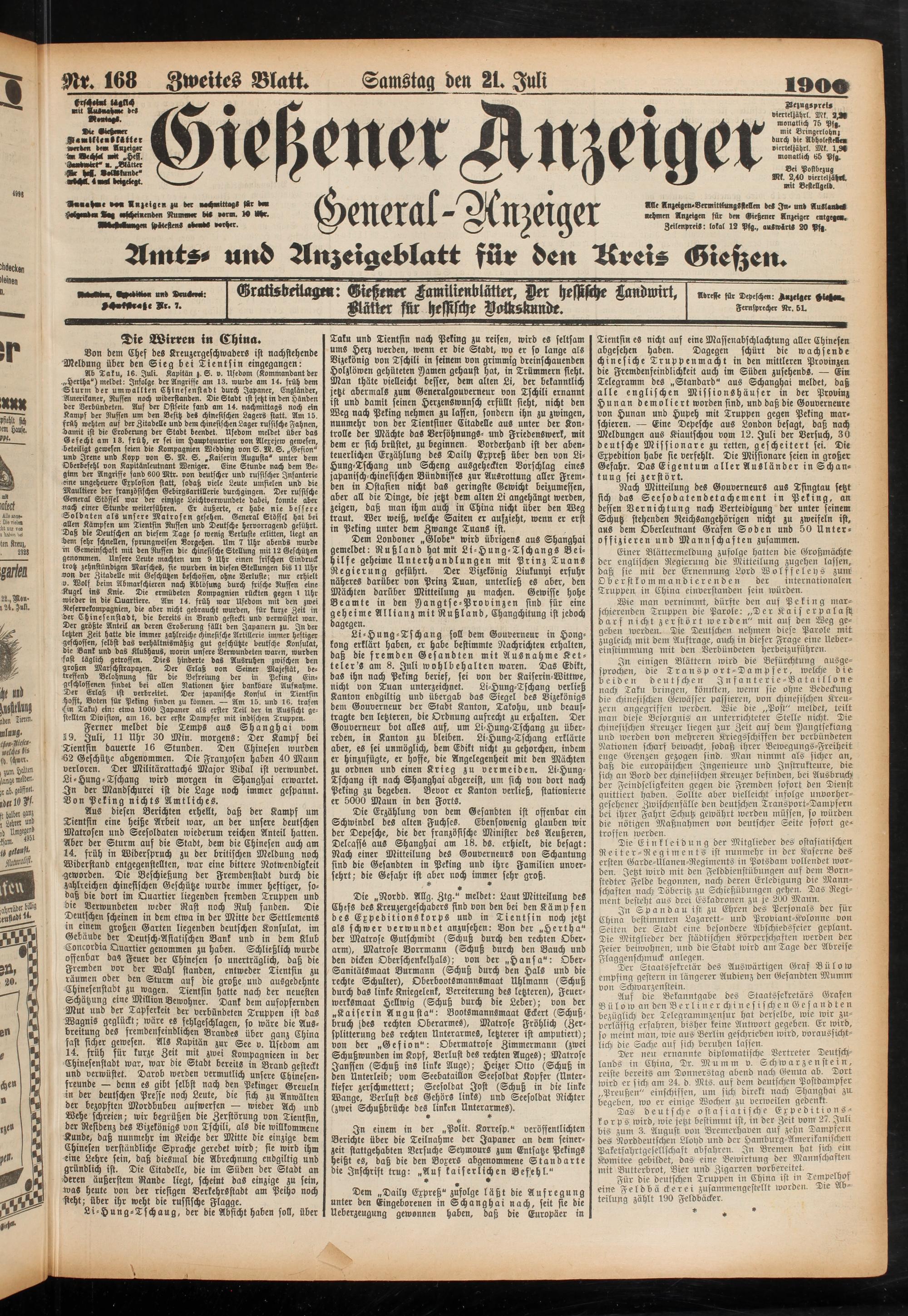 M. 168 Zweites Blatt. Samstag den 21 Juli