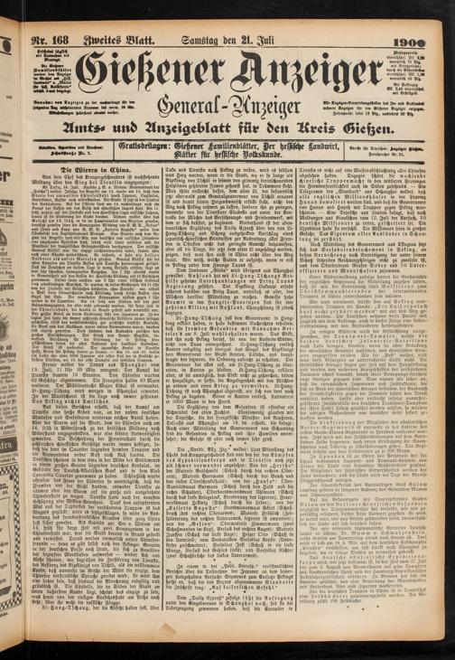 Die Erzählung von dem Gesandten ist offenbar ein Schwindel des alten Fuchses. Ebensowenig glauben wir der Depesche, die der französische Minister des Aeußeren, Delcasss aus Shanghai am 18. ds. erhielt, die besagt: Nach einer Mitteilung des Gouverneurs von Schantung sind die Gesandten in Peking und ihre Familien unversehrt; die Gefahr ist aber noch immer sehr groß.