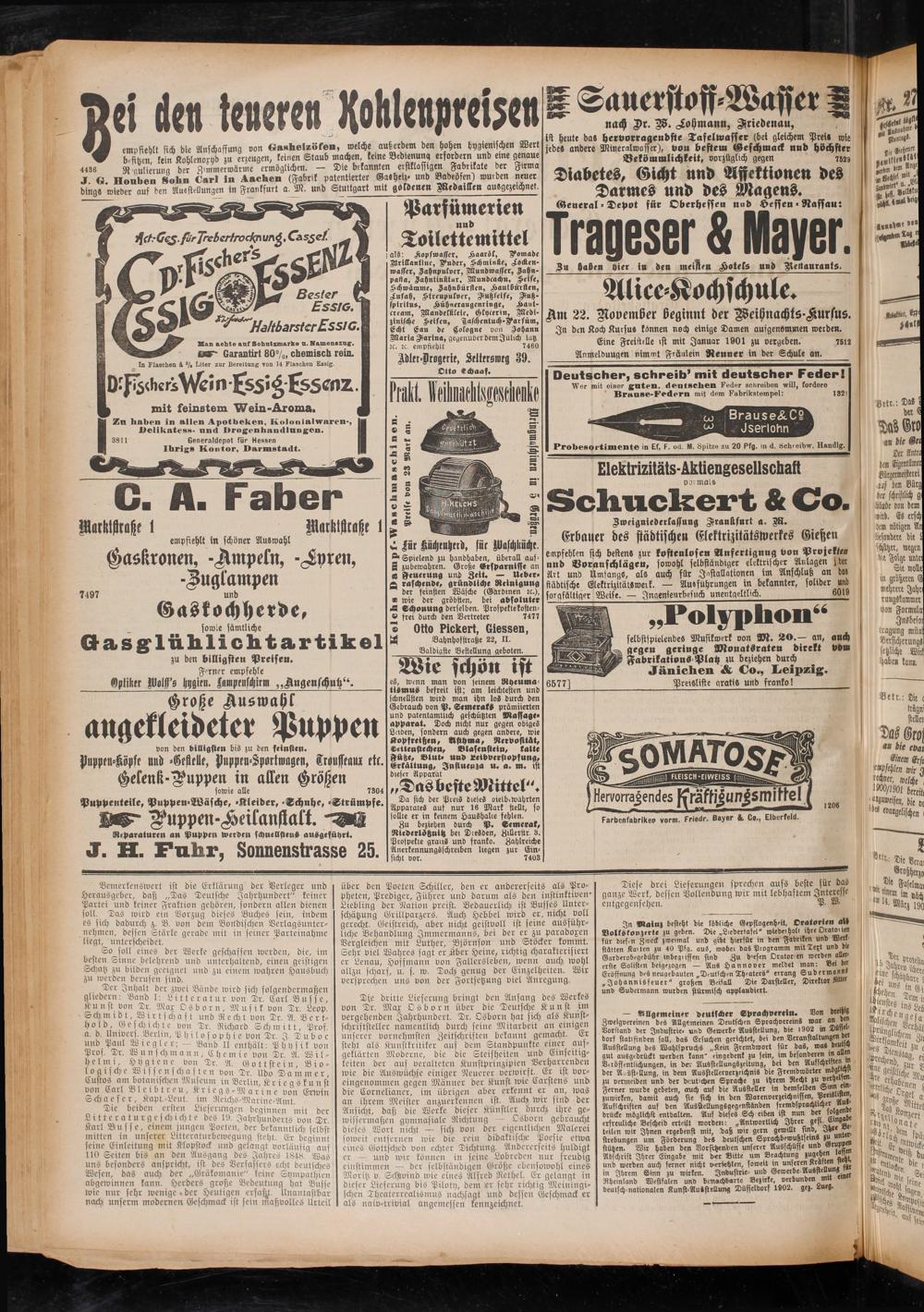 In Mainz besteht die löbliche Gepflogenh>-it, Oratorien ai§ Bolkskonzerle zu geben. Die ^Liedertafel" wiede»holt ihre Oratonen für diesin Zweck zweimal und gibt hierfür in den Fabriken und Werk stätten Ka>ten zu 40 Pfg. auS, wobei das Programm mit Text und vir Garderobegebühr inbegiisfen sind Zu d'efen Orator en werden aller' erste Solisten beigezogen — Aus Hannover meldet man: Bei der Eröffnung des neugebauten „DeutschenTheaters" errang Sudermanno „Johannisfeuer" großen Beiiall Die Darsteller, Direktor und Sudermann wurden stürmisch applaudiert.