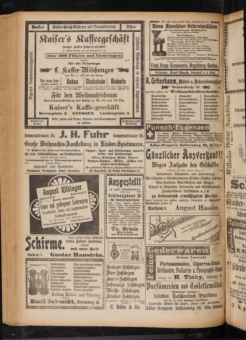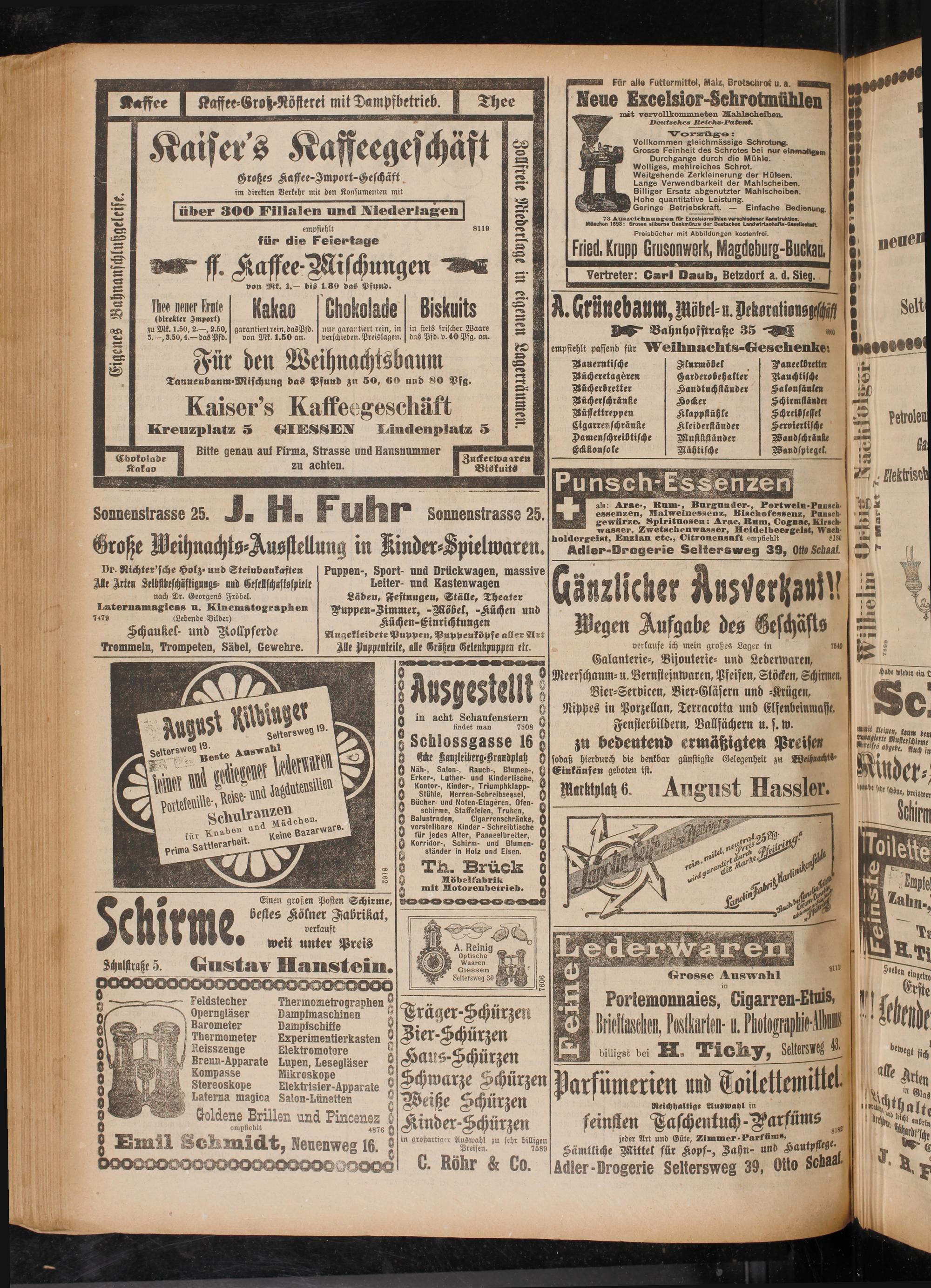 feinsten Haschenluch-Warfüms s jeder Art und Güte, Zimmer-Parfums, Sämtliche Wittel für Kopf-, Zahn- und KautpM^ Adler-Drogerie Seltersweg 39, Otto Sciiaa ■