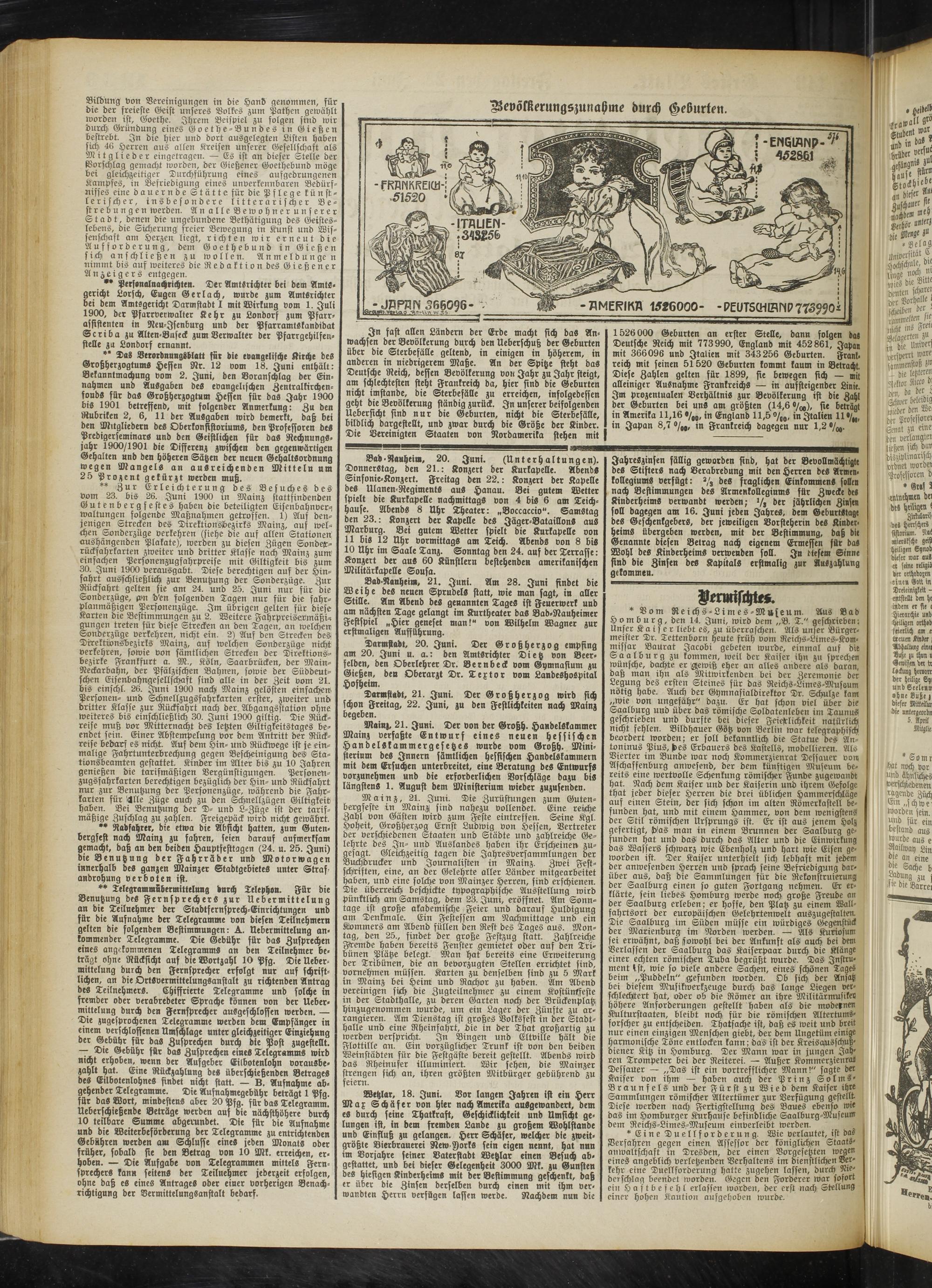1526 000 Geburten an erster Stelle, dann folgen da« Deutsche Reich mit 773990, England mit 452861, Japan mit 366096 und Italien mit 343256 Geburten. Frank« reich mit seinen 51520 Geburten kommt kaum in Betracht. Diese Zahlen gelten für 1899, sie bewegen sich — mit alleiniger Ausnahme Frankreichs — in aufsteigender Linie. Im prozentualen Verhältnis zur Bevölkerung ist die Zahl der Geburten bei uns am größten (14,6 %e)# sie beträgt in Amerika 11,16 •/«, in England 11,5 o/fle, in Italien 11%» in Japan 8,7 °/M, in Frankreich dagegen nur 1,2 «/w.