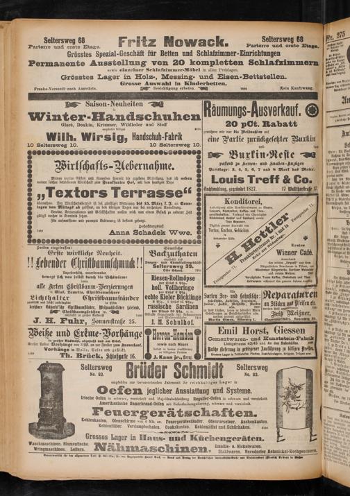 Meinen werten Gästen und Freunden Hiermit die ergebene Mitteilung, das ich neben meiner seither betriebenen Wirtschaft zum Frankfurter Hof, mit dem heutigen Tage „Textors Terrasse“ übernehme. Der Wirtschaftsbetrieb ist bei günstiger Witterung bis 15. März k. I. an Sonntagen von Mittags ab geöffnet, an den übrigen Tagen nur bei vorheriger Anmeldung.