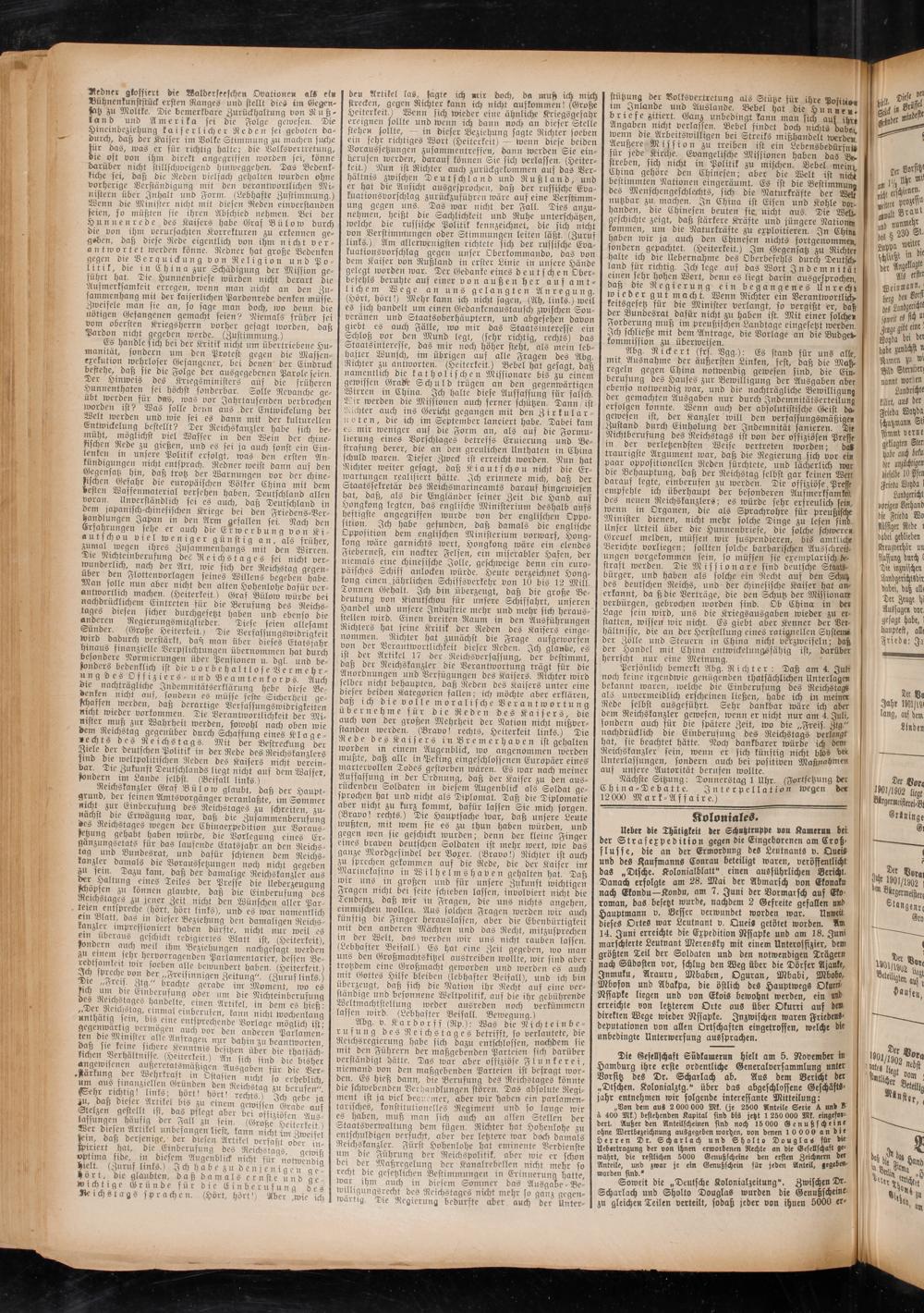 Abg. Rickert (frs. Vgg.): Es stand für uns alle, | Mit Ausnahme der äußersten Linken, fest, daß die Maß. regeln gegen China notwendig gewesen sind, die Einberufung des Hauses zur Bewilligung der Ausgaben aber ebenso notwendig war, und die nachträgliche Bewilligung der gemachten Ausgaben nur durch Jndemnitcitserteiluno erfolgen konnte. Wenn auch der absolutistische Geist da. gewesen ist, der Kanzler will den verfassungsmäßigen Zustand durch Einholung der Indemnität sanieren. Die Nichtberufung des Reichstags ist von der offiziösen Presst in der verletzendsten Weise vertreten worden; daR traurigste Argument war, daß die Regierung sich vor ein । paar oppositionellen Reden fürchtete, und lächerlich war die Behauptung, daß der Reichstag selbst gar keinen Wert darauf legte, einberufen zu werden. Die offiziöse PrG empfehle ich überhaupt der besonderen Aufmerksamkeit des neuen Reichskanzlers; es würde sehr erfreulich fein, wenn in Organen, die als Sprachrohre für preußische Minister dienen, nicht mehr solche Dinge zu lesen sind. Unser Urteil über die Hunnenbriefe, die solche schweren Greuel melden, müssen wir suspendieren, bis amtliche Berichte vorliegen; sollten solche barbarischen Ausschreü- ungen vorgekommen sein, so müssen sie exemplarisch be- straft werden. Die Missionare sind deutsche Staate bürger, und haben als solche ein Recht auf den Schutz des deutschen Reichs, und der chinesische Kaiser hat anerkannt, da ß die Verträge, die den Schutz der Missionark verbürgen, gebrochen worden sind. Ob China in der Lage sein wird, uns die Kriegsausgaben wieder zu er statten, wissen wir nicht. Es giebt aber Kenner der Ver hältnisse, die nieder Herstellung eines rationellen Systeme der Zölle und Steuern in China nicht verzweifeln; daß der Handel mit China entwickelungsfähig ist, darüber herrscht nur eine Meinung.