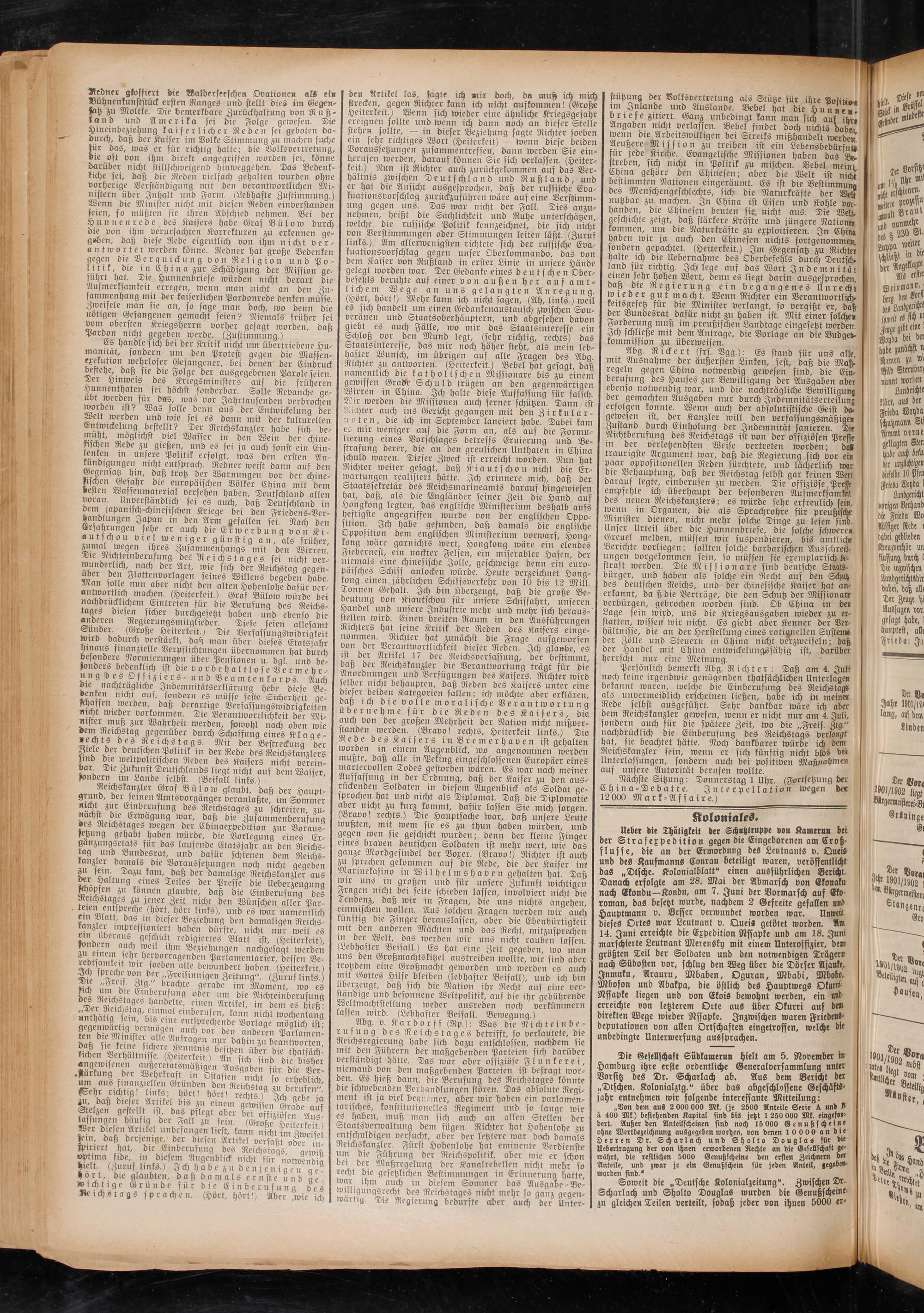 | ereignen sollte und wenn ich dann noch an dieser Stelle I stehen sollte, — in dieser Beziehung sagte Richter soeben | ein sehr richtiges Wort (Heiterkeit) — wenn diese beiden I Voraussetzungen zusammentreffen, dann werden Sie ein- I berufen werden, darauf können Sie sich verlassen. (Heiter- | leit.) 9hln ist Richter auch zurückgekommen auf das Ver- I hältnis zwischen Deutschland und Rußland, und I ^r hat die Ansicht ausgesprochen, daß der russische Eva- I kuationsvorschlag zurückzuführen wäre auf eine Vershimm- I ung gegen uns. Das war nicht der Fall. Dies anzu- I nehmen, heißt die Sachlichkeit und Ruhe unterschätzen, I welche die russische Politik kennzeichnet, die sich nicht I von Verstimmungen oder Stimmungen leiten läßt. (Zuruf I links.) Am allerwenigsten richtete sich der russische Eva- I kuationsvorschlag gegen unser Oberkommando, das von I dem Kaiser von Rußland in erster Linie in unsere Hände I gelegt worden war. Der Gedanke eines deutschen Ober- I befehls beruhte auf einer von außen her auf am t- I lichem Wege an uns gelangten Anregung. I (Hört, hört!) Mehr kann ich nicht sagen, (Ah, links.) weil I es sich handelt um einen Gedankenaustausch zwischen Sou- I veränen und Staatsoberhäuptern, und abgesehen davon | giebt es auch Fälle, wo mir das Staatsinteresse ein I Schloß vor den Mund legt, (sehr richtig, rechts) das I Staatsinteresse, das mir noch höher steht, als mein leb- I Hafter Wunsch, im übrigen auf alle Fragen des Abg. I Richter zu antworten. (Heiterkeit.) Bebel hat gesagt, daß I namentlich die katholischen Missionare bis zu einem I gewissen Grave Schuld trügen an den gegenwärtigen | Wirren in China. Ich halte diese Auffassung für falsch. I 2-ir werden die Missionen auch ferner schützen. Tann ist I Richter auch ins Gericht gegangen mit den Zirkular- I noten, die ich im September lanciert habe. Dabei kam I ec, mir weniger auf die Form an, als auf die Formu- ! I lierung eines Vorschlages betreffs Eruierung und Be- I strafung derer, die an den greulichen Unthaten in China I schuld waren. Dieser Zweck ist erreicht worden. Nun hat