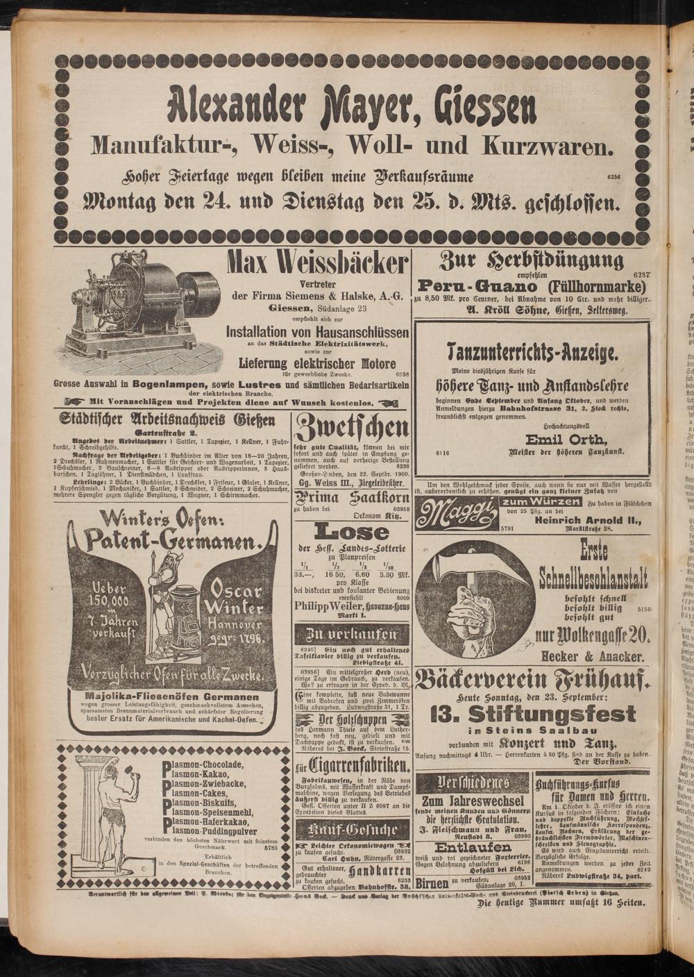 Vertreter der Firma Siemens & Halske, A.-G. Giessen, Südanlage 23 empfiehlt sieh zur