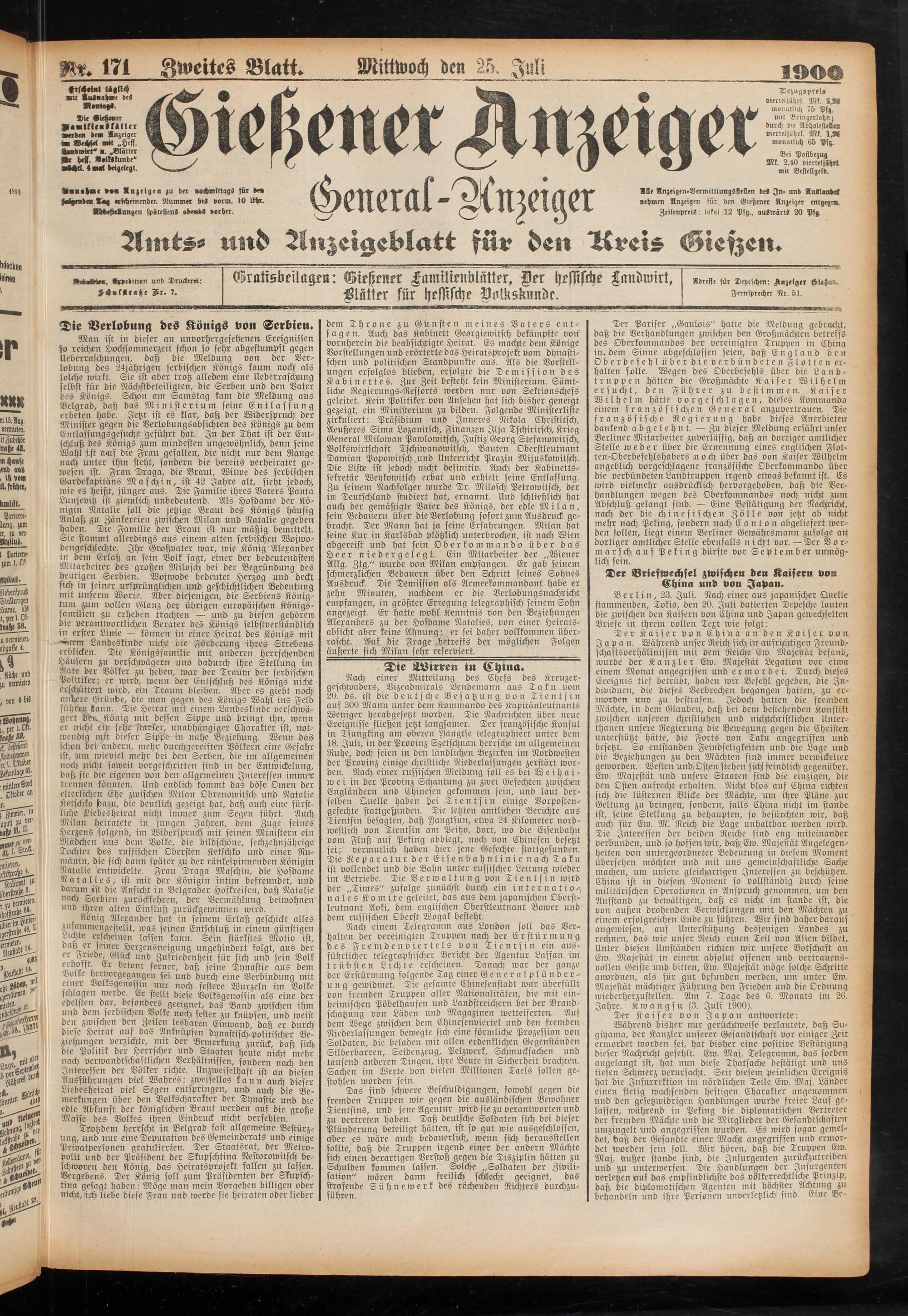 Während bisher nur gerüchtweise verlautete, daß Sn- giyama, der Kanzler unserer Gesandtschaft vor einiger Zeit ermordet worden sei, hat bisher eine positive Bestätigung dieser Nachricht gefehlt. Ew. Maj. Telegramm, das soeben angelangt ist, hat nun diese Thatsache bestätigt und uns tiefen Schmerz verursacht. Seit diesem peinlichen Ereignis hat die Insurrektion int nördlichen Teile Ew. Maj. Länder einen stetig wachsend eit heftigen Charakter angenommen und den gesetzwidrigen Handlungen wurde freier Lauf gelassen, während in Peking die diplomatischen Vertreter der fremden Mächte und die Mitglieder der Gesandtschaften umzingelt und angegriffen wurden. Es wird sogar gemeldet, daß der Gesandte einer Macht angegriffen und ermordet worden sein soll. Wir hören, daß die Truppen Ew. Maj. äußer stände sind, die Insurgenten zurückzutreibeni und zu unterwerfen. Die Handlungen der Jnsurgenwn verletzen äuf das empfindlichste das völkerrechtliche Prinzip, daß die diplomatischen Agenten mit höchster Achtung zu behandeln und ihre Personen unverletzlich sind. Eine Be-