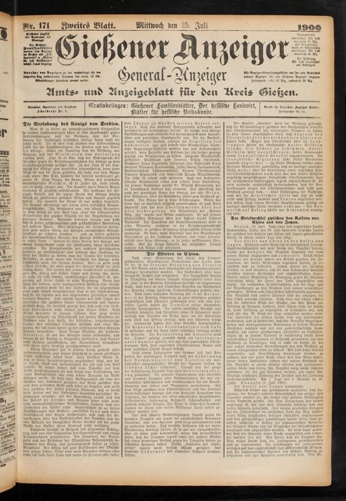Der Kaiser von China an den Kaiser von Japan. Während unser Reich sich in aufrichtigen Freundschaftsverhältnissen mit oem Reiche Cw. Majestät befand, wurde der Kanzler Ew. Majestät Legation vor etwa einem Monat angegriffen und ermordet. Durch dieses Ereignis tief betrübt, haben wir Befehl gegeben, die Individuen, die dieses Verbrechen begangen hatten, zu ermorden uno zu bestrafen. Jedoch hatten die sremden Mächte, in dem Glauben, daß bei dem bestehenden Konflikt zwischen unseren christlichen und nichtchristlichen Unter» thanen unsere Regierung die Bewegung gegen die Christen unterstützt hätte, die Forts von Taku angegriffen und besetzt. So entstanden Feindseligkeiten und die Lage und die Beziehungen zu den Mächten sind immer verwickelter geworden. Westen und, Osten ftehen sich feindlich gegenüber. Ew. Majestät und unsere Staaten sind die einzigen, die den Osten aufrecht erhalten. Nicht blos auf China richten sich die lüsternen Blicke der Mächte, um ihre Pläne zur Geltung zu bringen, sondern, falls China nicht int stände ist, seine Stellung zu behaupten, so befürchten wir, daß auch für Ew. M. Reich die Lage unhaltbar werden wird. Die Interessen der beiden Reiche sind eng miteinander verbunden, und so hoffen wir, daß Ew. Majestät Angelegenheiten von untergeordneter Bedeutung in diesem Moment übersehen möchten und mit uns gemeinschaftliche Sache machen, um unsere gleichartigen Interessen zu beschützen. China ist in diesem Moment so vollständig durch seine militärischen Operationen in Anspruch genommen, um den Aufstand zu bewältigen, daß es nicht int stände ist, die von außen drohenden Verwicklungen mit den Mächten zu einem erfolgreichen Ende zu führen. Wir sind daher darauf angewiesen, auf Unterstützung desjenigen Landes zu rechnen, das wie unser Reich einen Teil von Asien bildet. Unter diesen Umständen richten wir unsere Botschaft an Ew. Majestät in einem absolut offenen und vertrauensvollen Geiste und bitten, Ew. Majestät möge solche Schritte anordnen, als für gut befunden werden, um unter Ew. Majestät mächtiger Führung den Frieden und die Ordnung wiederherzustellen. Am 7. Tage des 6. Monats int 26. Jahre. Kwangsu (3. Juli 1900).