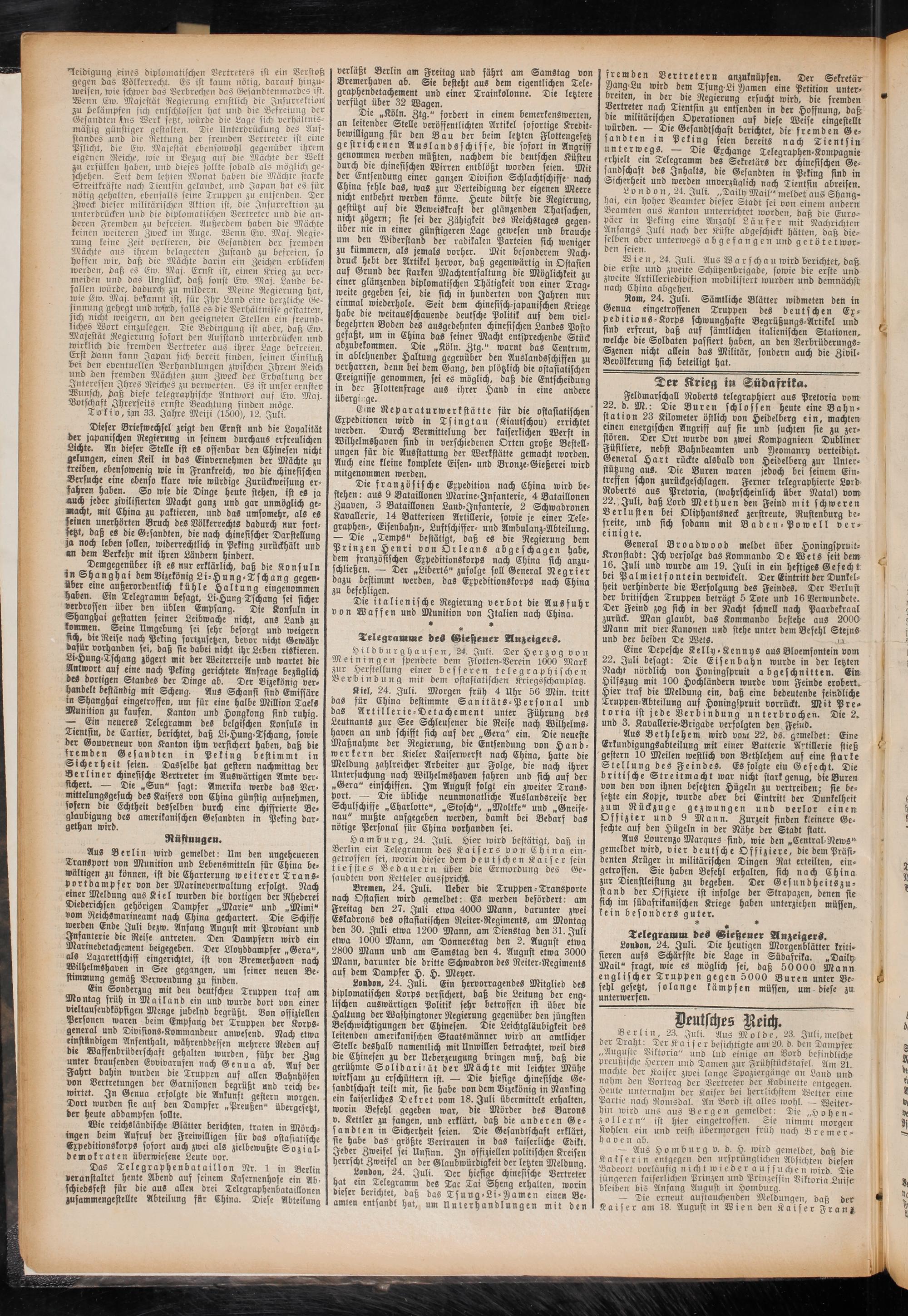 Feldmarschall Roberts telegraphiert aus Pretoria vom 22. d. M.: Die Buren schlossen heute eine Bahnstation 23 Kilometer östlich von Heidelberg ein, machten einen energischen Angriff auf sie und suchten sie zu zerstören. Der Ort wurde von zwei Kompagnieen Dubliner Füsiliere, nebst Bahnbeamten und Deomanry verteidigt. General Hart rückte alsbald von Heidelberg zur Unterstützung aus. Die Buren waren jedoch bei seinem Eintreffen schon zurückgeschlagen. Ferner telegraphierte Lord Roberts aus Pretoria, (wahrscheinlich über Natal) vom 22. Juli, daß Lord Methuen den Feind mit schweren Verlusten bei Oliphantsneck zerstreute, Rustenburg befreite, und sich sodann mit Baden-Powell vereinigte.