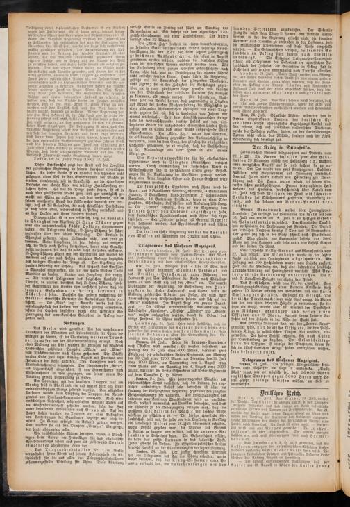Bremen, 24. Juli. Neber die Truppen - Transporte nach Ostasien wird gemeldet: ES werden befördert: am Freitag den 27. Juli etwa 4000 Mann, darunter zwei Eskadrons deS ostafiatischen Reiter-Regiments, am Montag den 30. Juli etwa 1200 Mann, am Dienstag den 31. Juli etwa 1000 Mann, am Donnerstag den 2. August etwa 2800 Mann und am Samstag den 4. August etwa 3000 Mann, darunter die dritte Schwadron des Reiter-Regiments aus dem Dampfer H. H. Meyer.