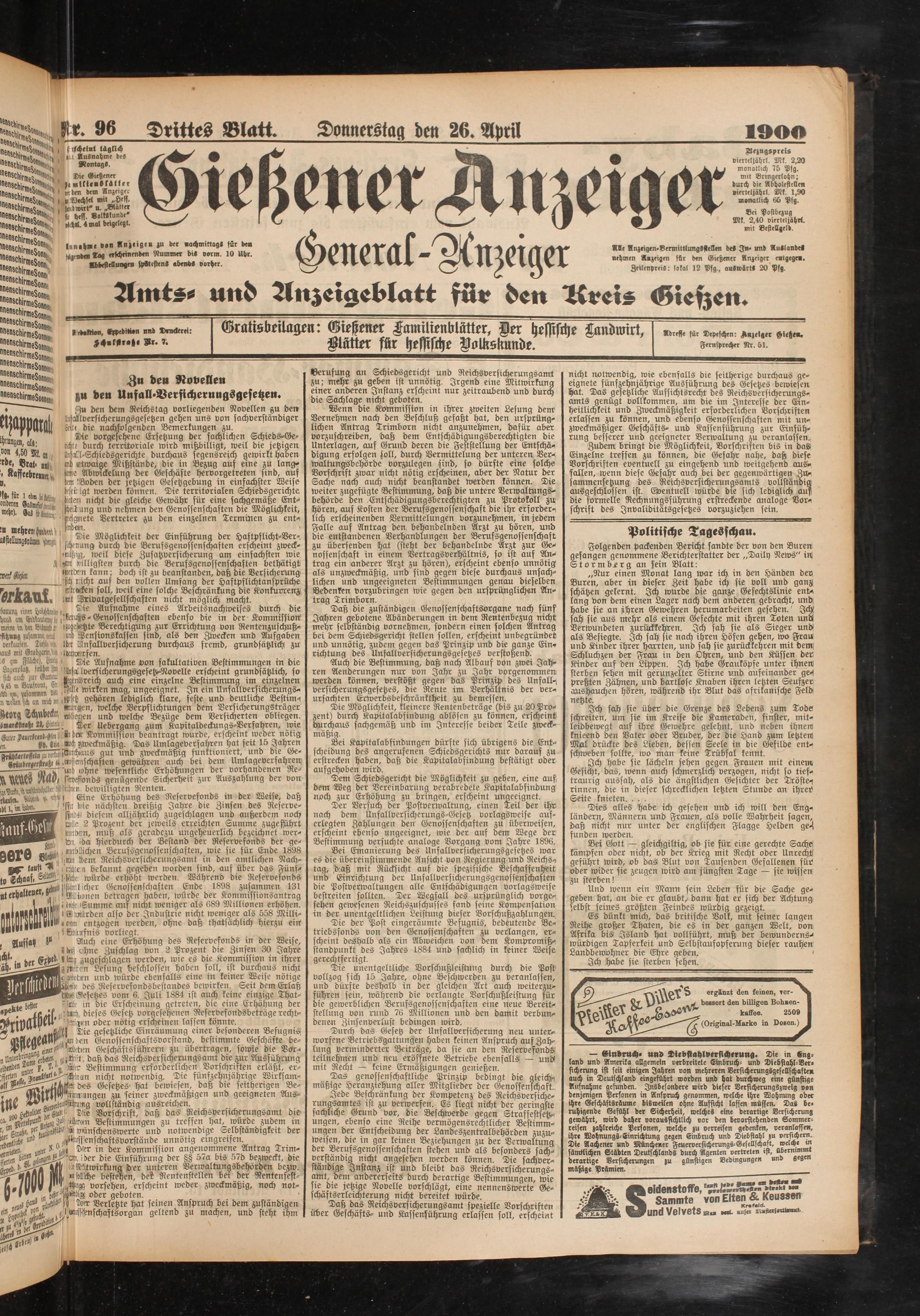 Adresse für Depeschen: Anzeiger Hießen.