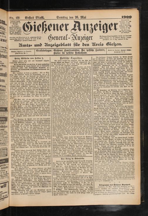 Alle Anzeigen-BerrnittlungSstellen deS In« und Ausland«» nehmen Anzeigen für den Gießener Anzeiger entgegen. ZeilenpreiS: lokal 12 Pfg., auswärts 20 Pfg.