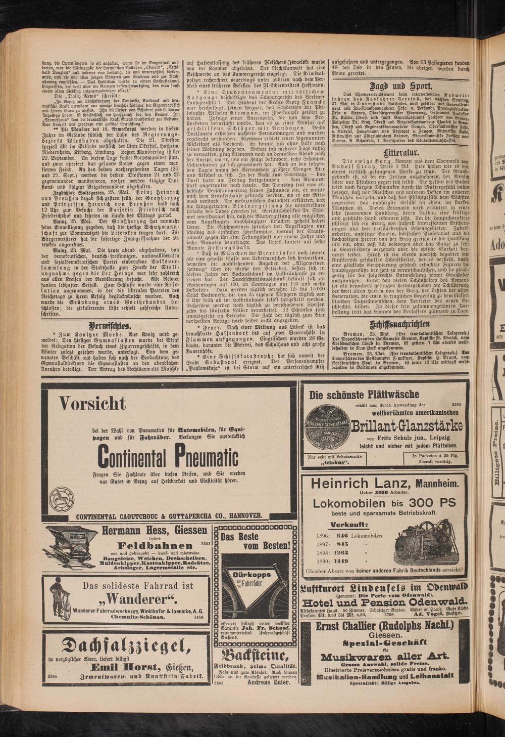 Das Ehrenpreisrichteramt beim internationalen Radwettfahren des Radfahrer-Vereins, das nächsten Sonntag 27. Mai, in Darmstadt stattfindet, wird gebildet aus Generalleutnant und Divisionskommandeur Frhr. v. Perbandt, Provinzialdirektor Frhr. d. Grancy, Oberbürgermeister Morneweg, Geheimrat Professor Dr. Kittler, Oberst und funkt Generaladjutant Freiherr von Grancy, Polizeirat Dr. Kratz, Oberst und Brigadekommandeur Charles de Beau.' lieu, Oberst und Regimentskommandeur Conzen, Oberstallmeister Frhr. v. Riedesel, Haup'mann und Adjutant v. Zangen, Rittmeister Kade, Rittmeister und Flügeladjutant Krämer, Steuerkommisiär Frecherr von Diemar, R Schneider, 1. Vorsitzender des Studentenausschusses.