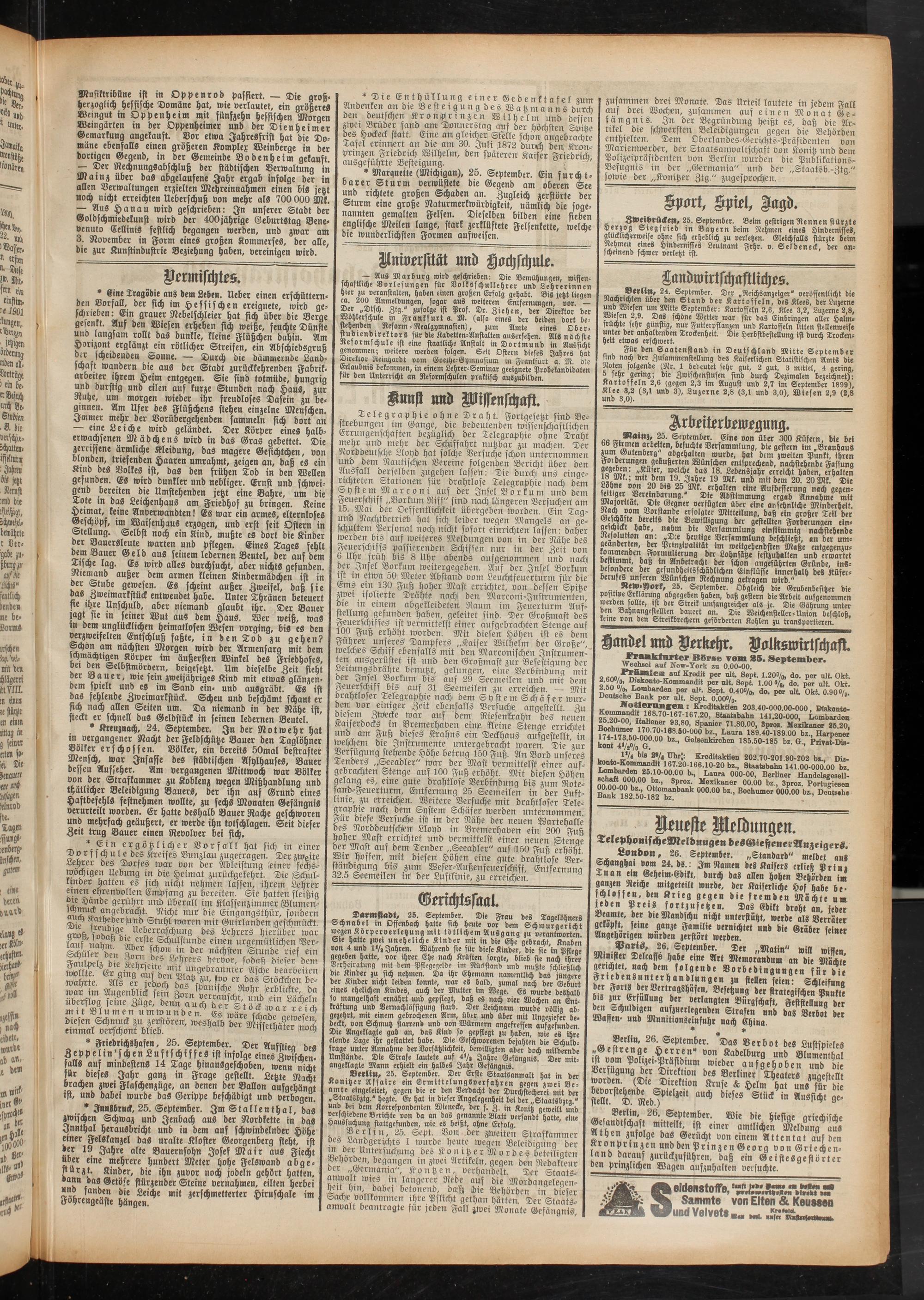 Für den Saatenstand in Deutschland Mitte September stnd nach der Zusammenstellung des Kaiserlichen Statistischen Amts die Noten folgende (Nr. 1 bedeutet sehr gut, 2 gut, 3 mittel, 4 gering, 5 sehr genug; dre Zwischenstufen sind durch Dezimalen bezeichnet): Kartoffeln 2,6 (gegen 2,3 im August und 2,7 im September 1899), Klee 3,2 (3,1 und 3), Luzerne 2,8 (3,1 und 3,0), Wiesen 2,9 (2,8 und 3,0). '