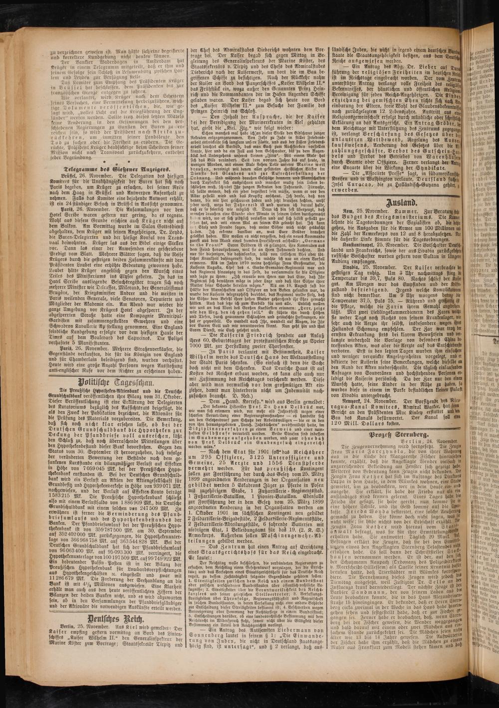 Berlin, 25. November. Aus Kiel wird gemeldet: Der Kaiser empfing gestern vormittag an Bord des Linienschiffes „Kaiser Wilhelm II.“ den Generalinspekteur der Marine Köster z'im Vortrage; Staatssekretär Tirpitz und
