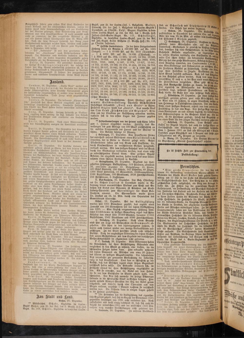 ** Aus dem Theaterbureau. Heute (Freitag) geht als neunte Volksvorstellung Charlotte Birch-PfeifferS fünfaktiges Lebensbild „Dorf und Stadt" in Szene. Fräulein Kugler spielt das „Lorle". Das neueste Werk von Otto Ernst „Flachsmann als Erzieher", ist soeben von der Direktion zur Aufführung erworben worden, dasselbe soll in den ersten Tagen des Januar gegeben werden.