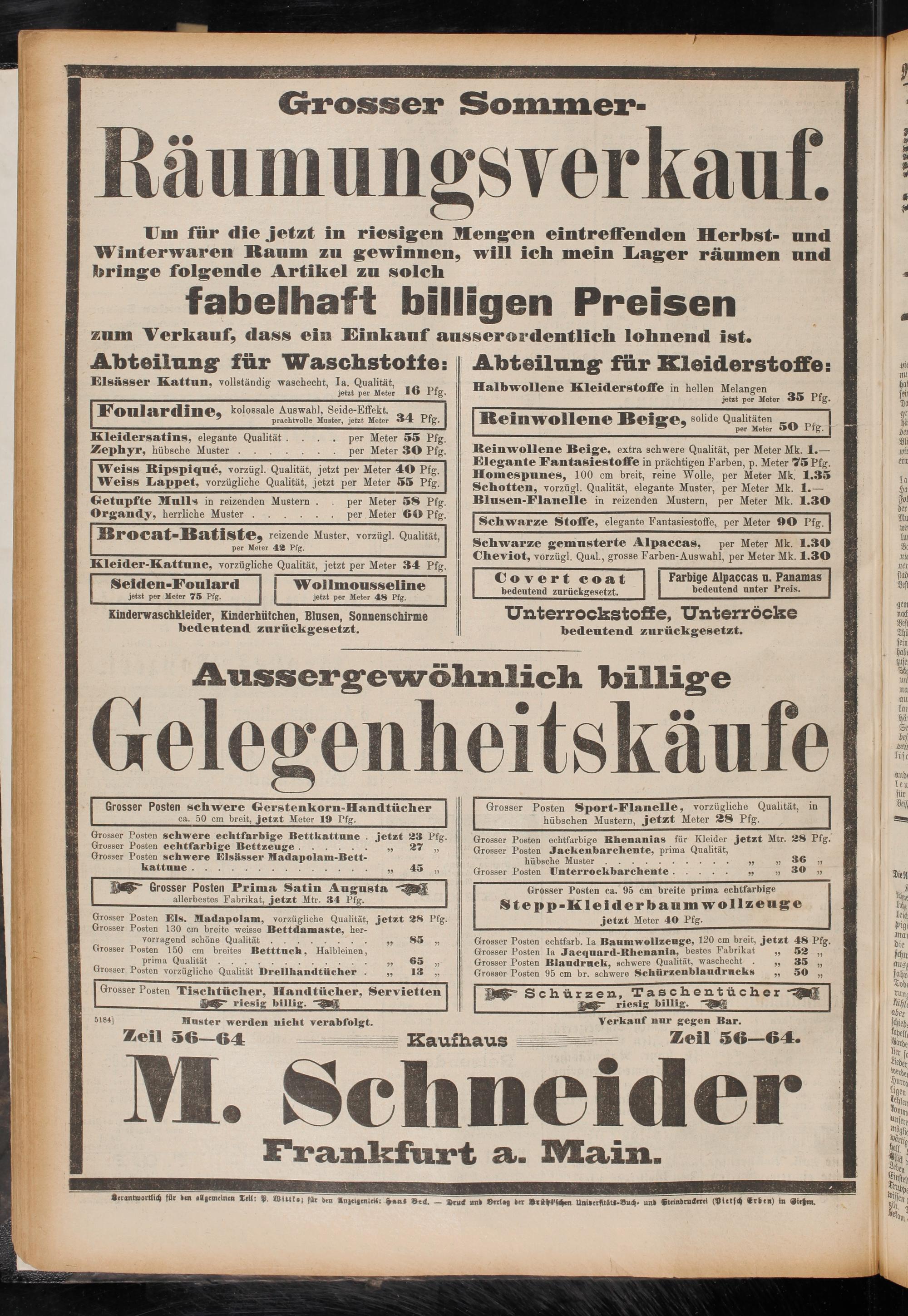 Grosser Posten echtfarbige Bhenanias für Kleider jetzt Mtr. 28 Pfg. Grosser Posten Jackenbarchente, prima Qualität, hübsche Muster ,, „ 36 „