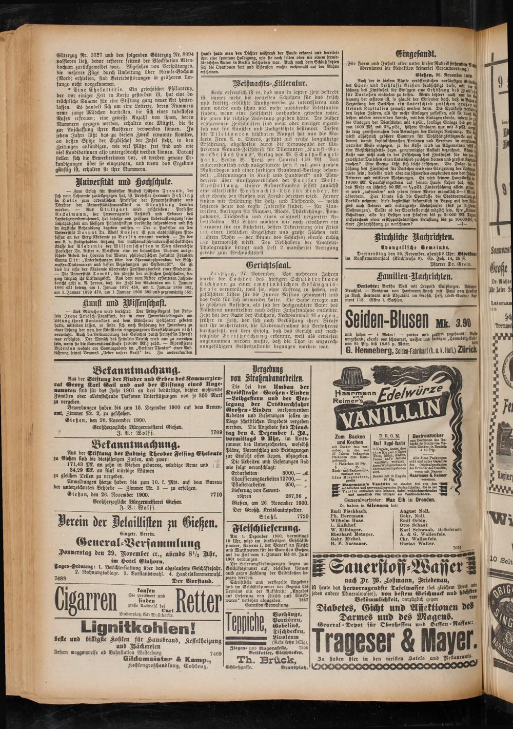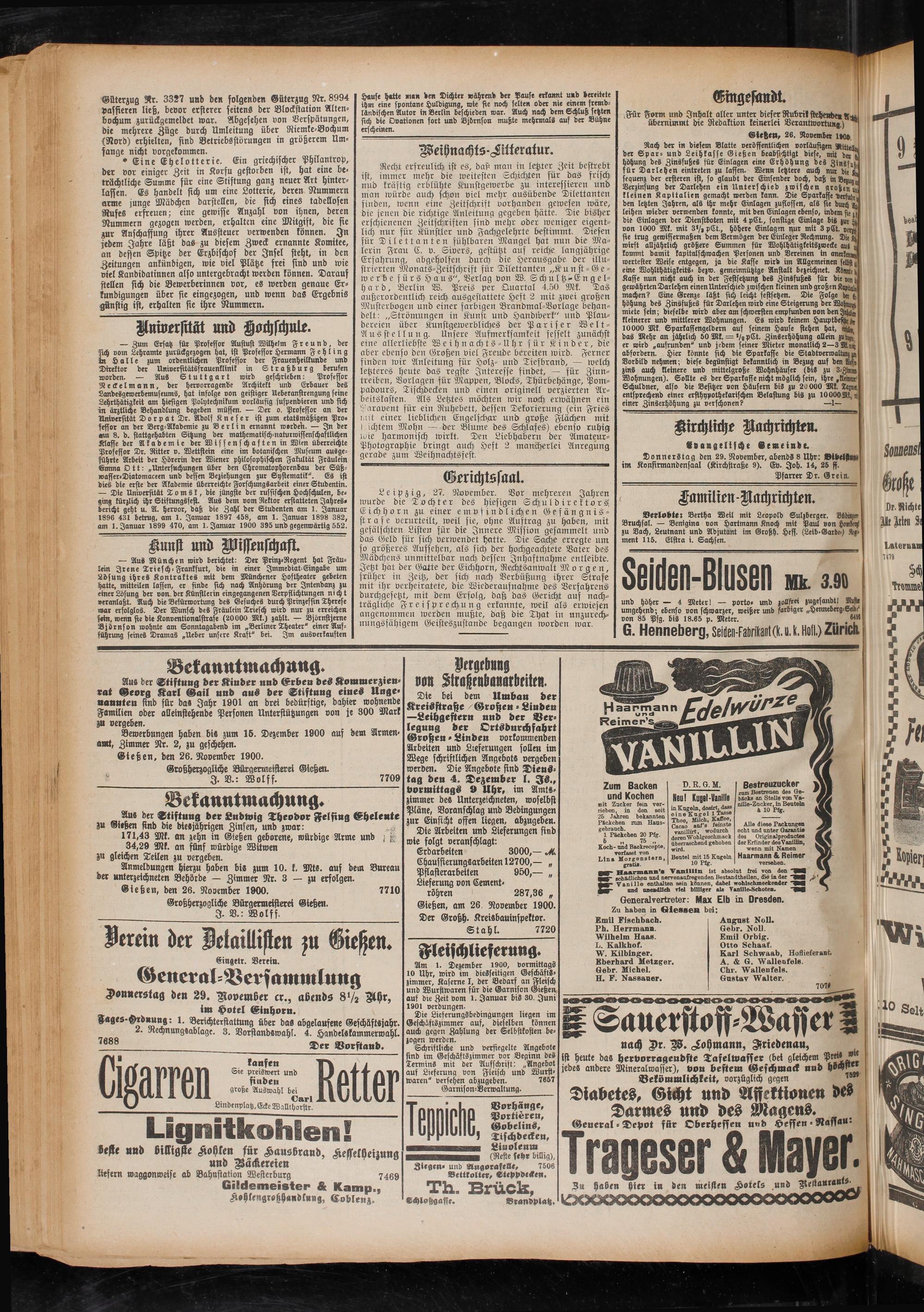 Am 1. Dezember 1900, vormittags 10 Uhr, wird im diesseitigen Geschäftszimmer, Kaserne I, der Bedarf an Fleisch und Wurstwaren für die Garnison Gießen auf die Zeit vom 1. Januar bis 30. Juni 1901 verdungen.