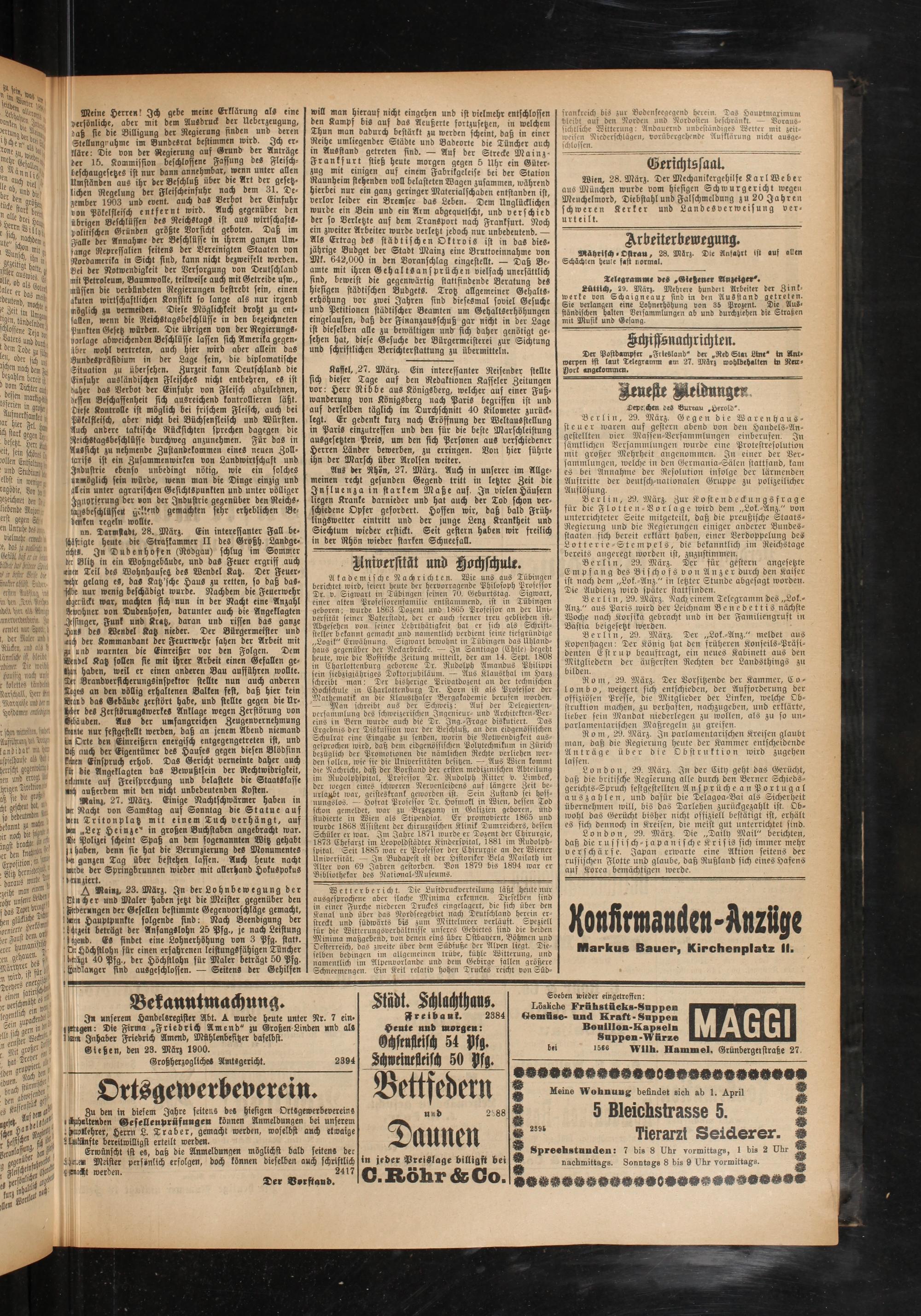 will man hieraus nicht eingehen und ist vielmehr entschlossen den Kampf bis auf das Aeußerte fortzusetzen, in welchem Thun man dadurch bestärkt zu werden scheint, daß in einer Reihe umliegender Städte und Badeorte die Tüncher auch in Ausstand getreten sind. — Auf der Strecke Mainz- Frankfurt stieß heute morgen gegen 5 Uhr ein Güterzug mit einigen auf einem Fabrikgeleise bei der Station Raunheim stehenden voll belasteten Wagen zusammen, während hierbei nur ein ganz geringer Materialschaden entstanden ist, verlor leider ein Bremser das Leben. Dem Unglücklichen wurde ein Bein und ein Arm abgequetscht, und verschied der so Verletzte auf dem Transport nach Frankfurt. Noch ein zweiter Arbeiter wurde verletzt jedoch nur unbedeutend. — Als Ertrag des städtischen Oktrois ist in das dies- jährige Budget der Stadt Mainz eine Bruttoeinnahme von Mk. 642,000 in den Voranschlag eingestellt. — Daß Beamte mit ihren GehaltSansprüchen vielfach unersättlich sind, beweist die gegenwärtig stattfindende Beratung des hiesigen städtischen Budgets. Trotz allgemeiner Gehaltserhöhung vor zwei Jahren sind diesesmal soviel Gesuche und Petitionen städtischer Beamten um Gehaltserhöhungen eingelaufen, daß der Finanzausschuß gar nicht in der Lage ist dieselben alle zu bewältigen unb sich daher genötigt gesehen hat, diese Gesuche der Bürgermeisterei zur Sichtung und schriftlichen Berichterstattung zu übermitteln.