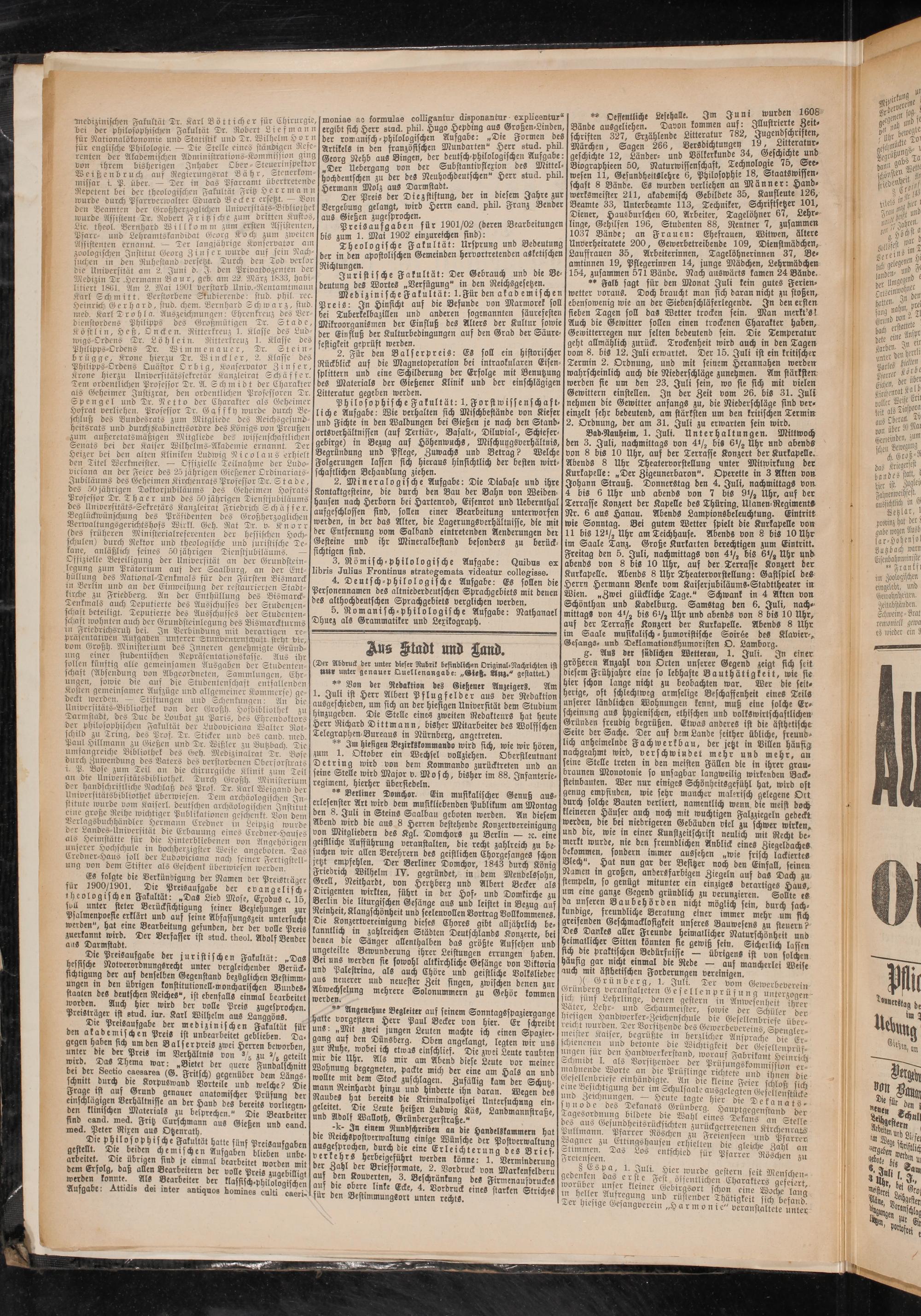 Es folgte die Verkündigung der Namen der Preisträger für 1900/1901. Die Preisaufgabe der evangelisch- theologischen Fakultät: „Das Lied Mose, Exodus c 15 fteter , Berücksichtigung seiner Beziehungen zur Psalmenpoefie erklärt und auf seine Abfassungszeit untersucht werden", hat eine Bearbeitung gefunden, der der volle Preis zuerkannt wird. Der Verfasser ist stud. theol. Adolf Bender aaS Darmstadt.