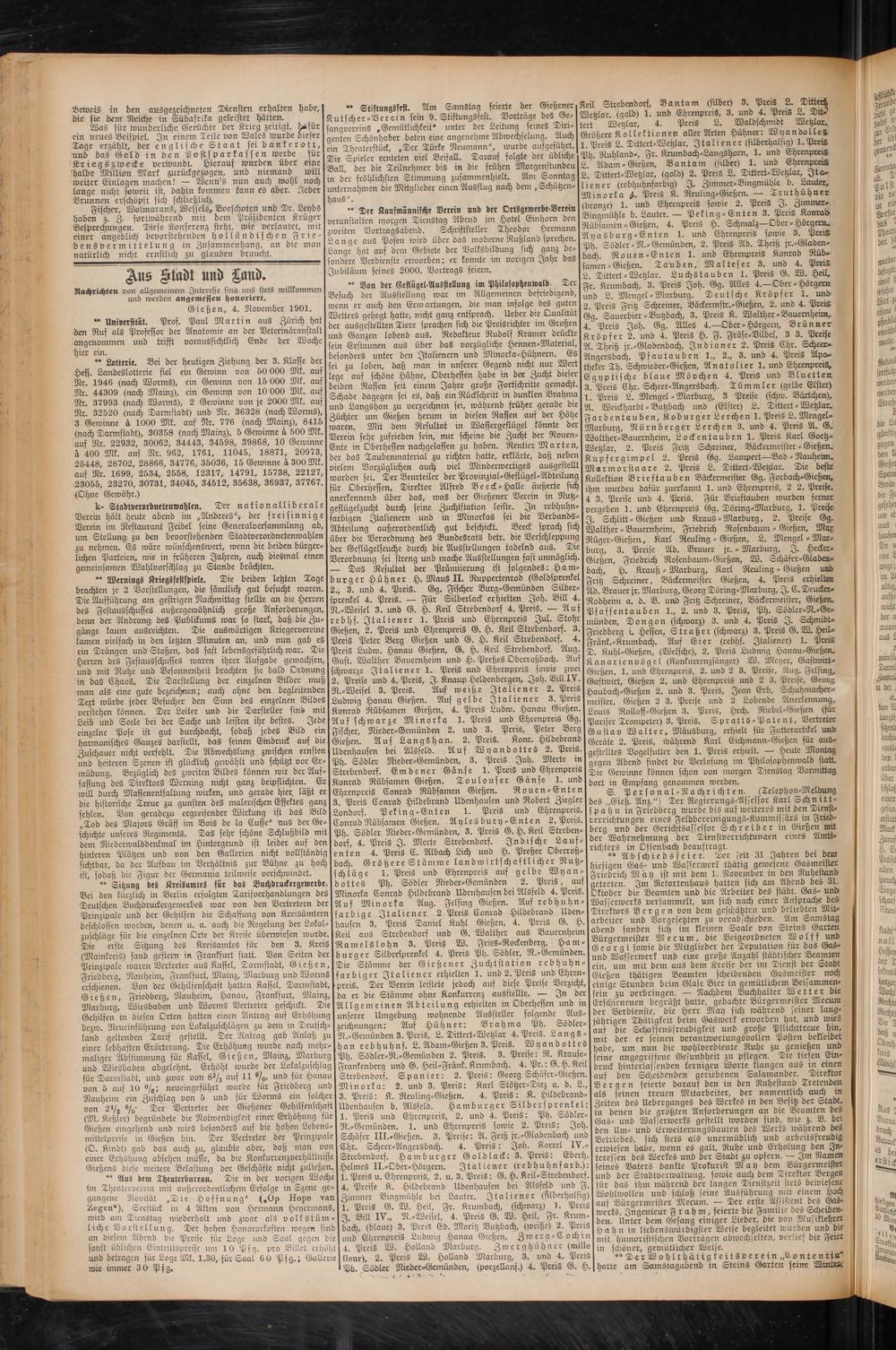 1. Preis und Ehrenpreis, 2. und 4. Preis: Ph. Södler- N.-Gemünden. 1. und Ehrenpreis sowie 2. Preis: Joh. Schäser III.-Gießen. 3. Preise: A. Feiß jr.-Gladenbach und Chr. Scheer-Angersbach. 4. Preis: Joh. Korrel IV.- Strebendorf. Hamburger Goldlack: 3. Preis: Eberh. Helmes II.-Ober-Hörgern. Italiener (rebhuhnfarb.): 1. Preis u. Ehrenpreis, 2. u. 3. Preis: G. H. Keil-Strebendorf.