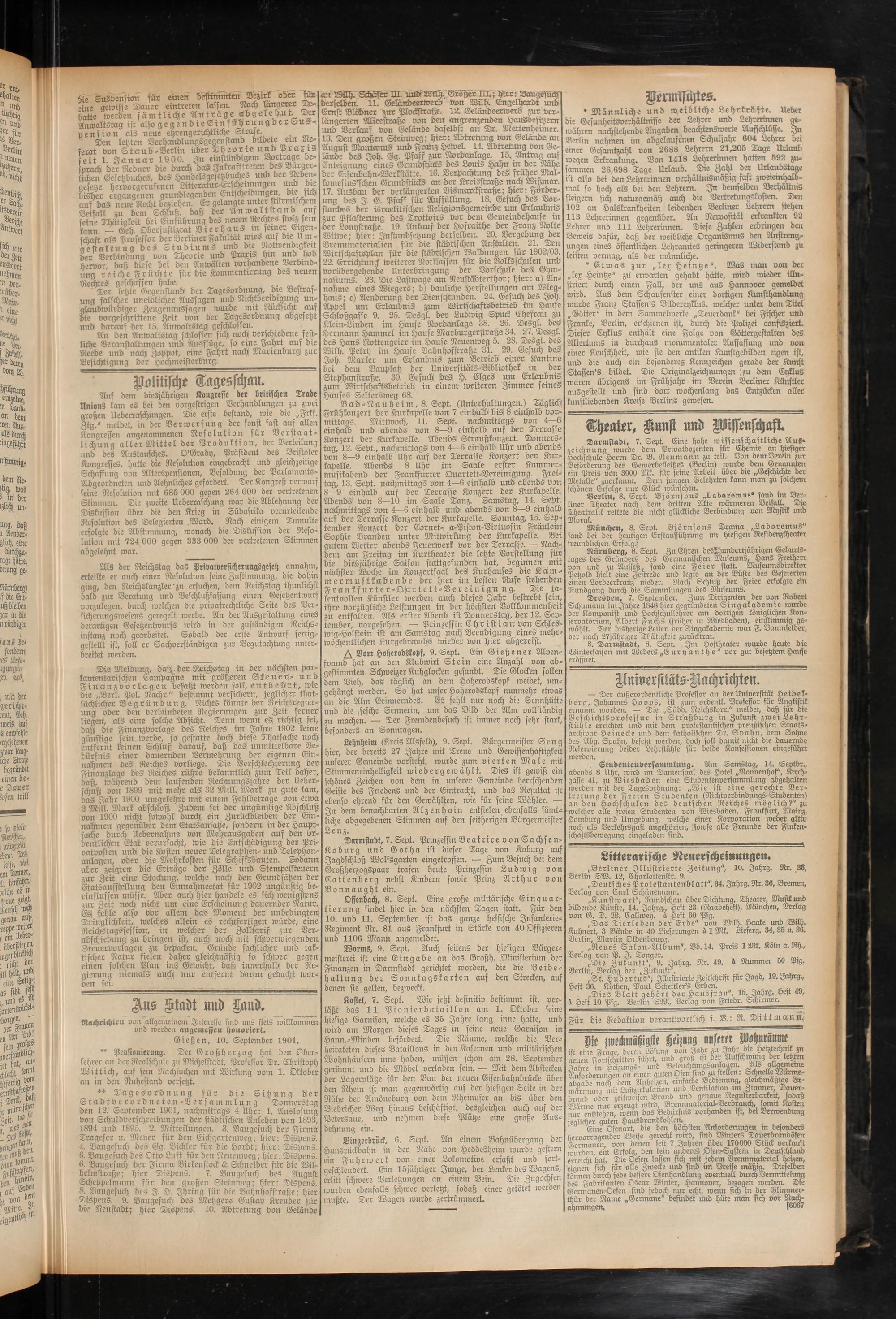 ** Tagesordnung für die Sitzung der Stadtverordneten-Versammlung Donnerstag den 12.' September 1901, nachmittags 4 Uhr: 1. Auslosung von Schuldverschreibungen der städtischen Anlehen von 1893, 1894 und 1895. 2. Mitteilungen. 3. Baugesuch der Firma Trageser u. Meher für den Cichgartcnweg; hier: Dispens. 4. Baugesuch des Gg. Bichler für die Hardt; hier: Dispens. 6. Baugesuch des Otto Luft für den Neuenweg; hier: Dispens. 6. Baugesuch der Firma Birkenstock & Schneider für die Wilhelm straße ; hier Dispens. 7. Baugesuch des August Scheppelmann für den großen Steinweg; hier: Dispens. 8. Baugesuch des I. 5). Jhring für die Bahnhofstraße; hier Dispens. 9. Baugesuch des Metzgers Gustav Kreuder für die Neustadt; hier Dispens. 10. Abtretung von Gelände