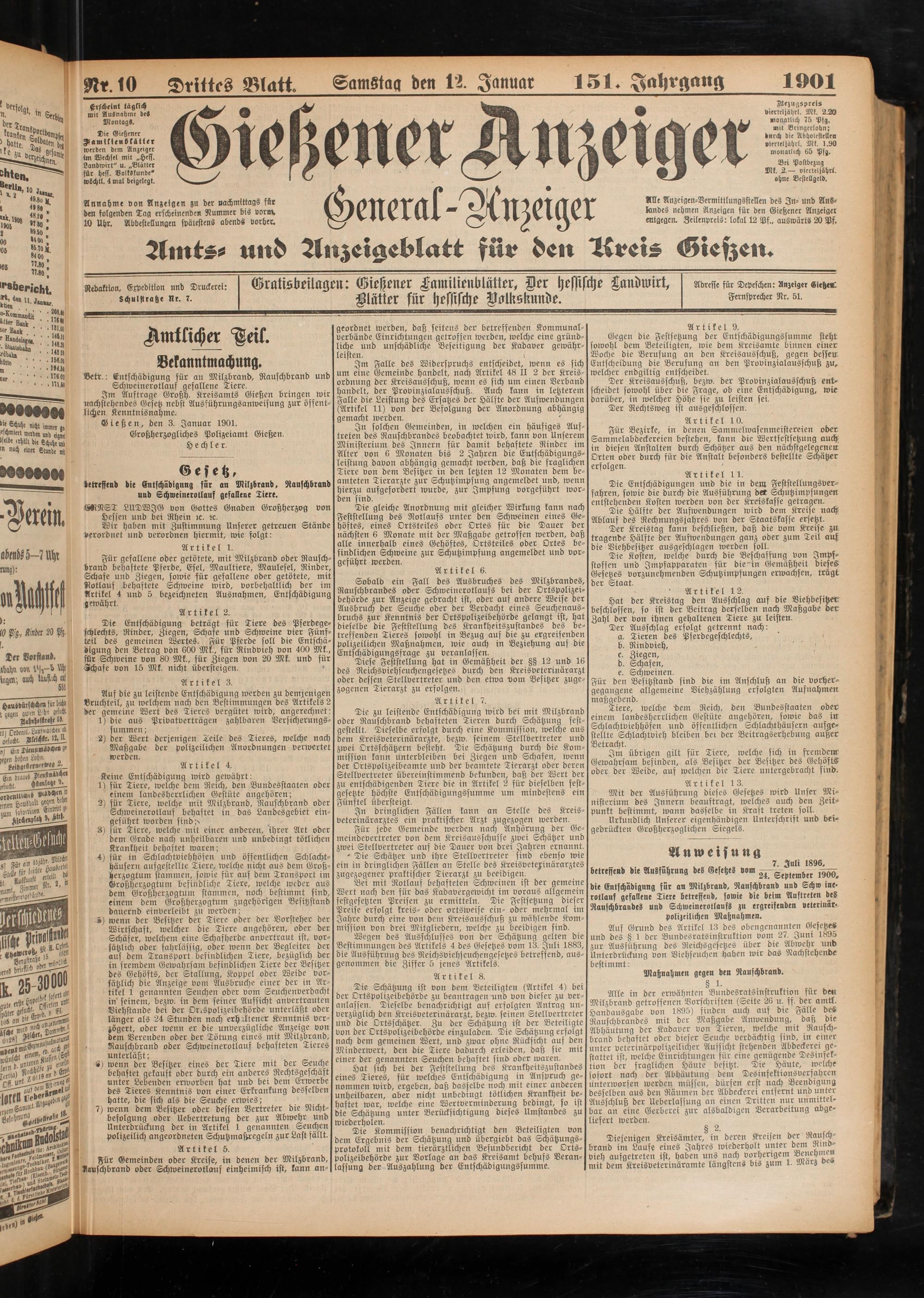 Gesetz, betreffend die Entschädigung für an Milzbrand, Rauschbraud und Schweinerotlauf gefallene Tiere.