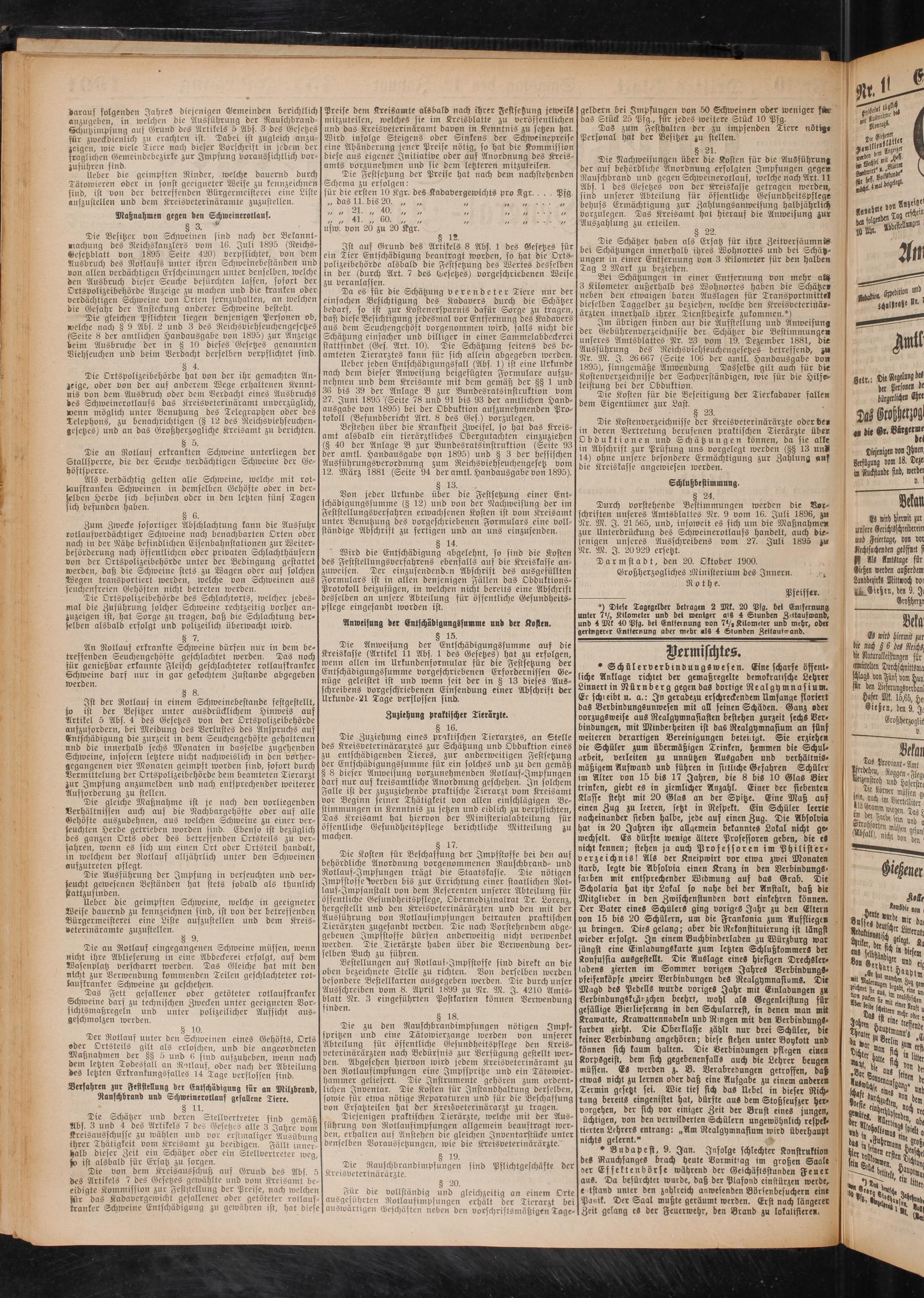 Die Ortspolizeibehörde hat von der ihr gemachten Anzeige, oder von der auf anderem Wege erhaltenen Kenntnis von dem Ausbruch oder dem Verdacht eines Ausbruchs des Schweinerotlaufs das Kreisveterinäramt unverzüglich, wenn möglich unter Benutzung des Telegraphen oder des Telephons, zu benachrichtigen (§ 12 des Reichsviehseuchengesetzes) und an das Großherzogliche Kreisamt zu berichten.